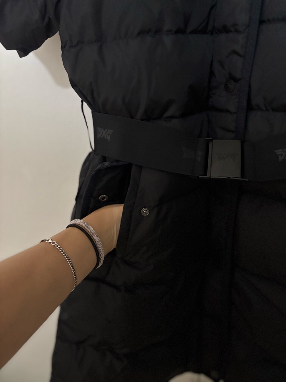 오리털 충전재로 겨울 라운딩에 적합한 후드 일체형 반팔 다운 패딩