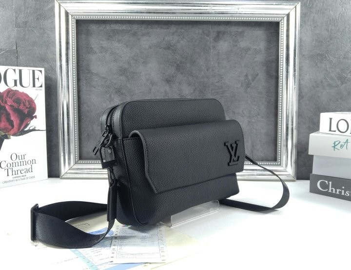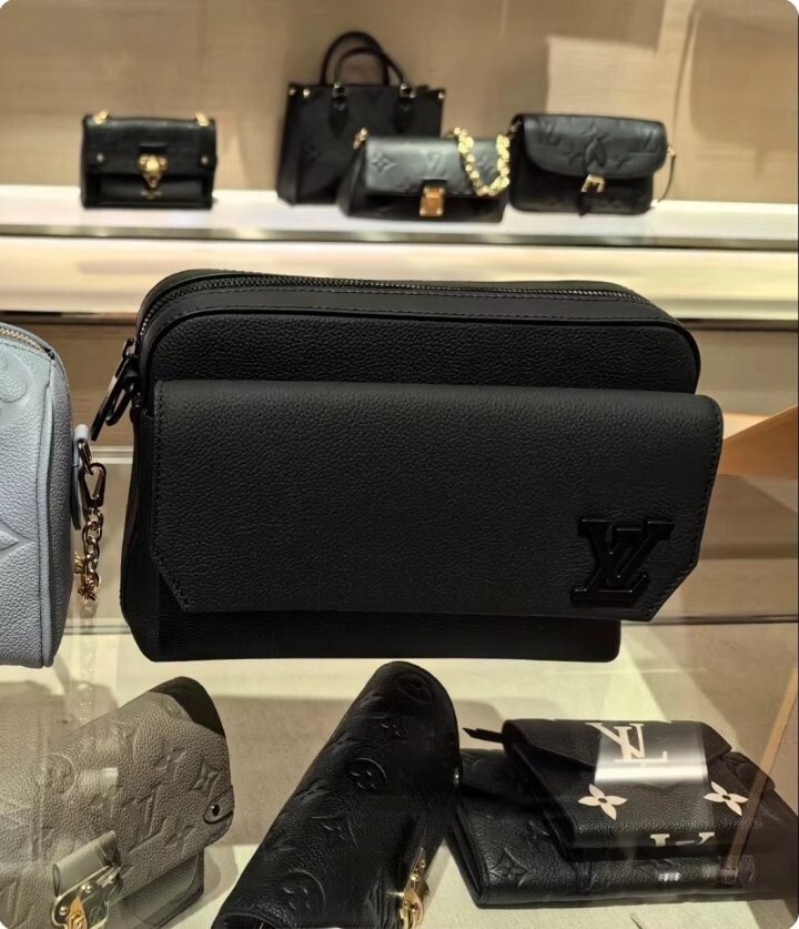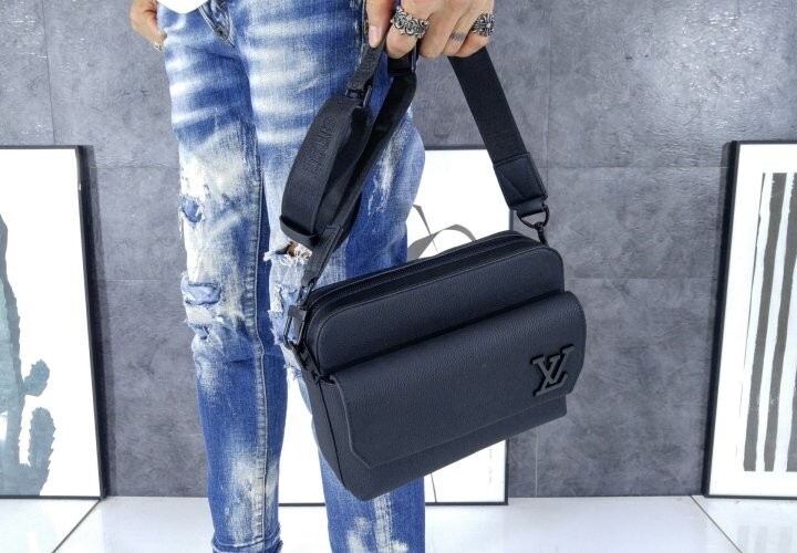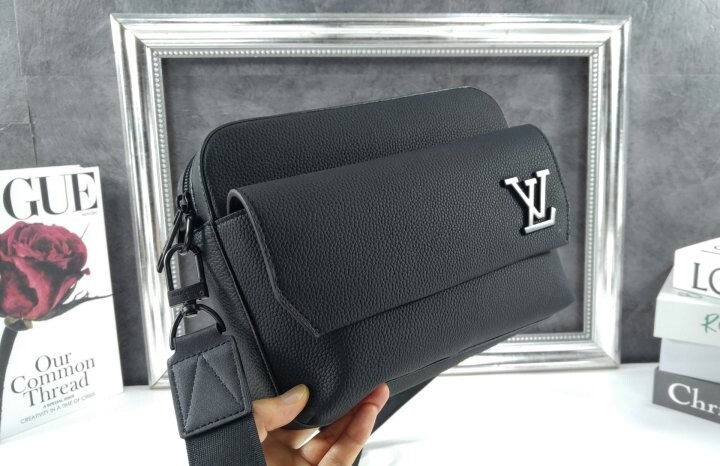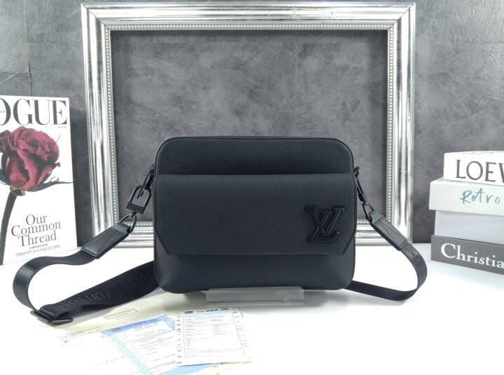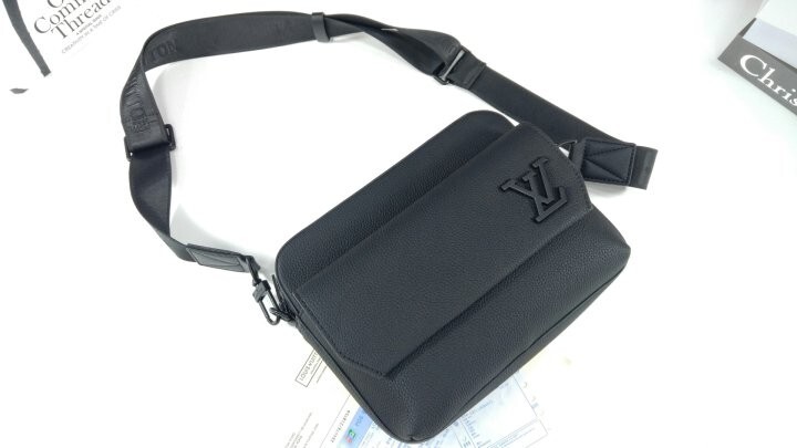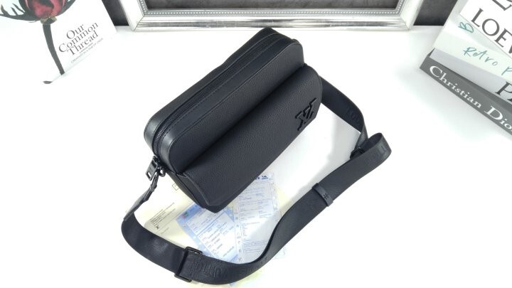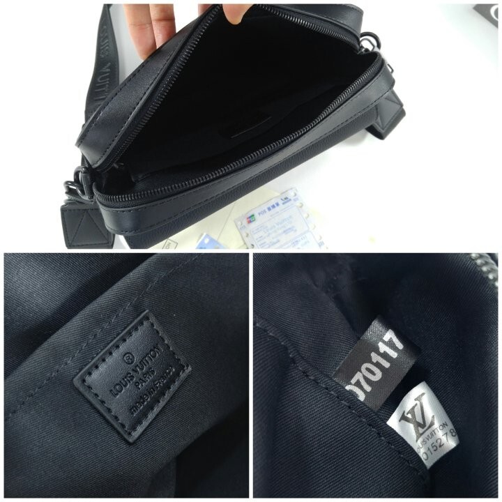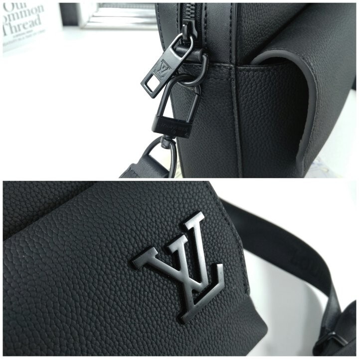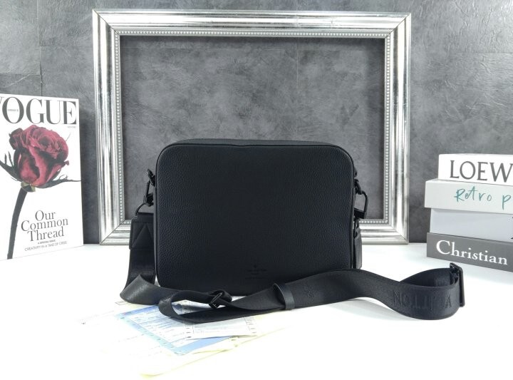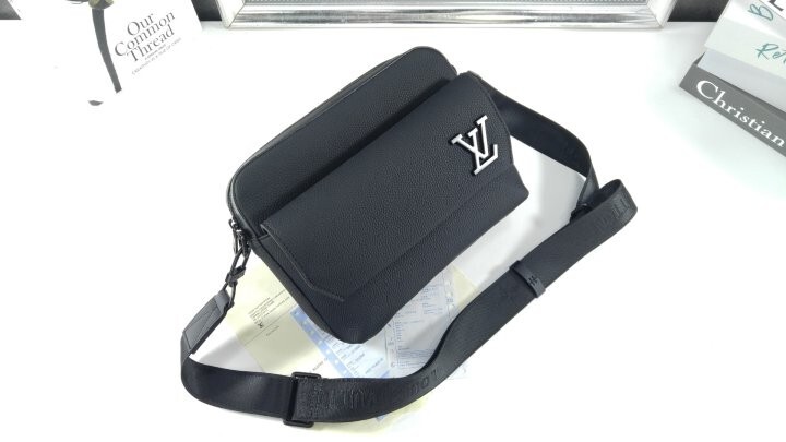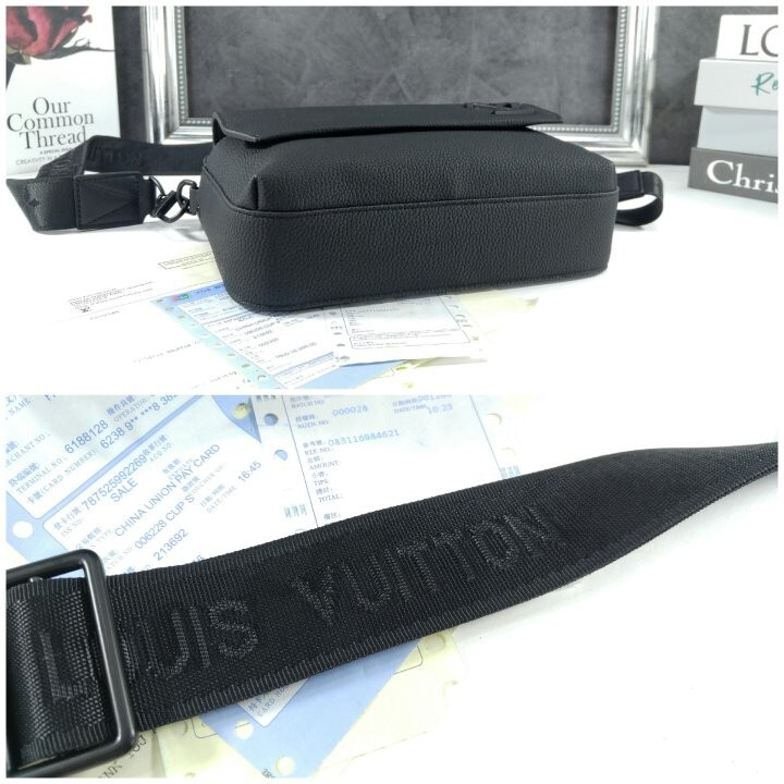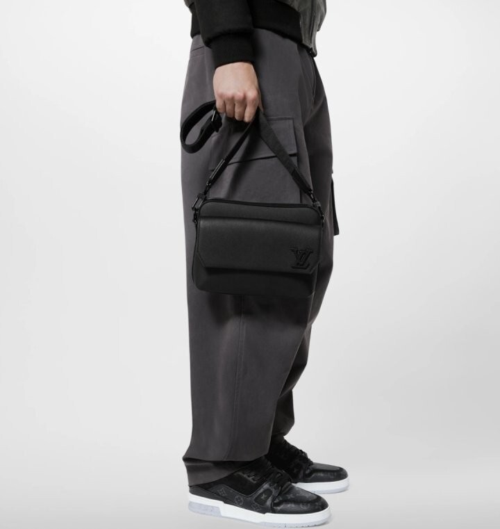블랙 카우하이드 가죽 카우하이드 가죽 소재의 트리밍 텍스타일 소재의 안감 블랙 색상 하드웨어 톤온톤 금속 소재의 LV 이니셜 지퍼형 잠금장치 자석형 잠금장치가 달린 앞면 플랩 스트랩:탈부착 가능, 길이 조절 가능