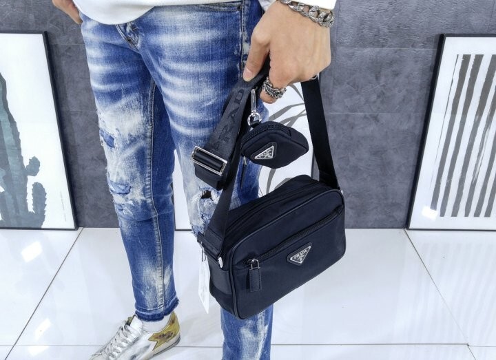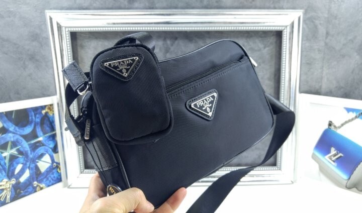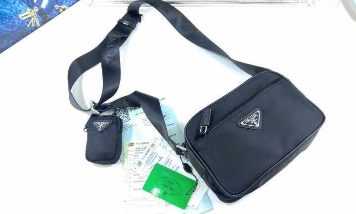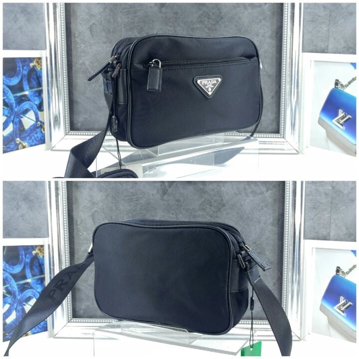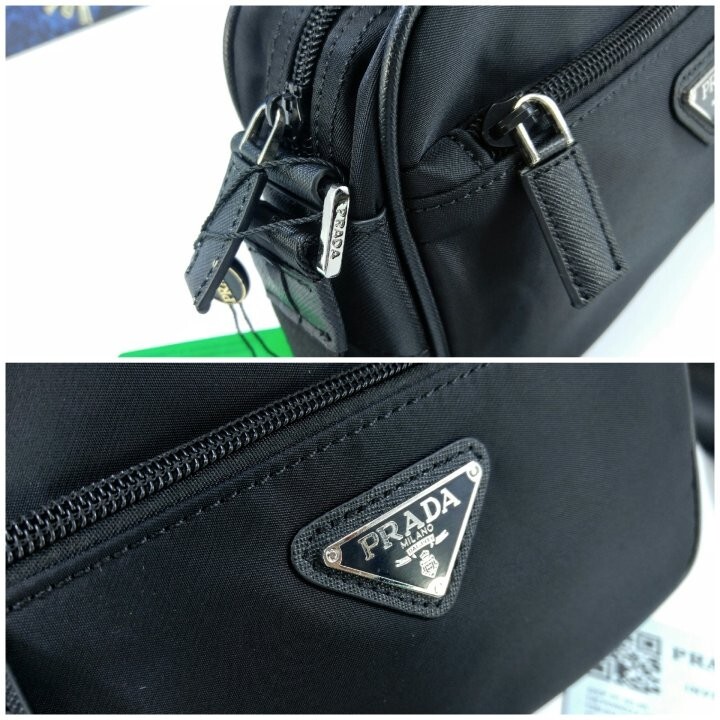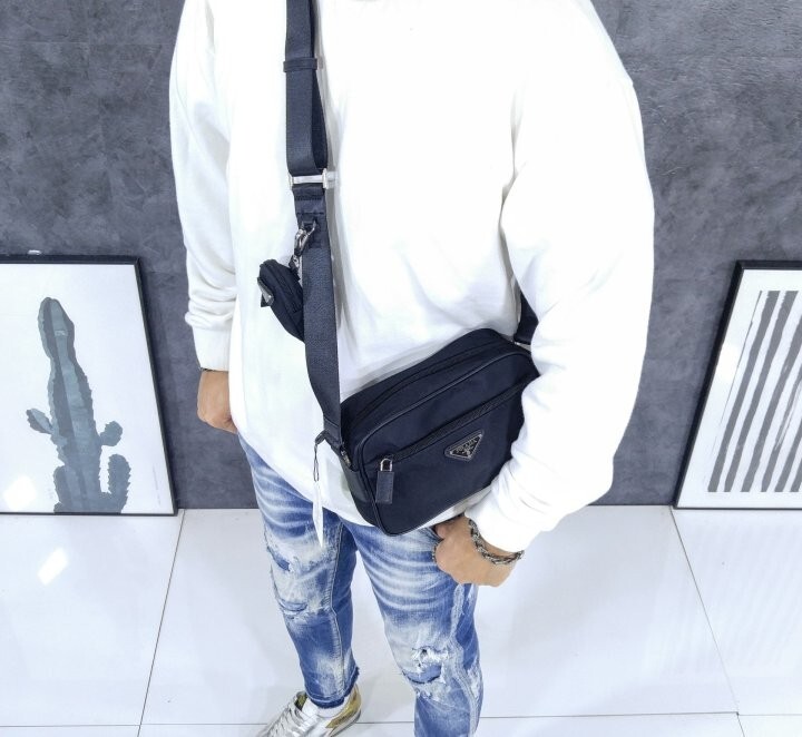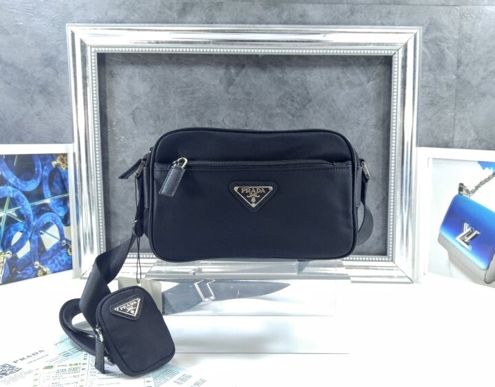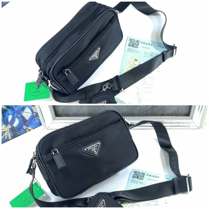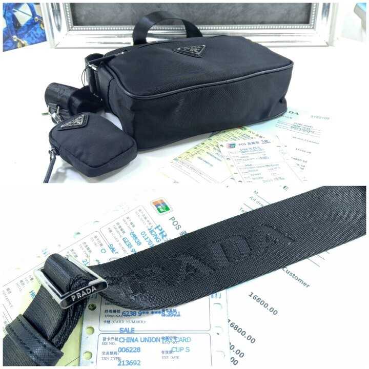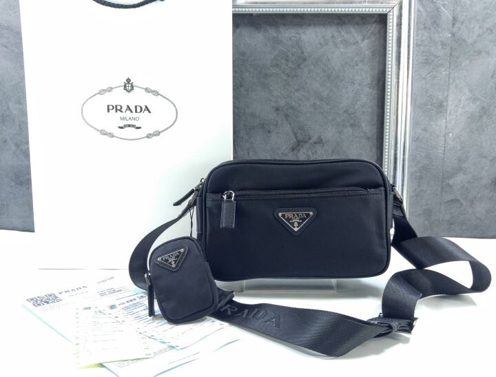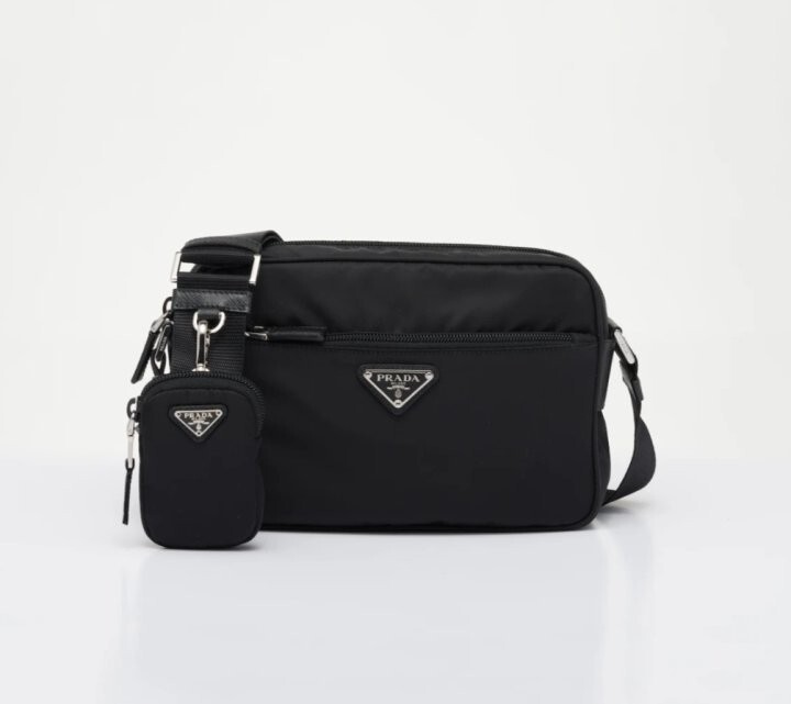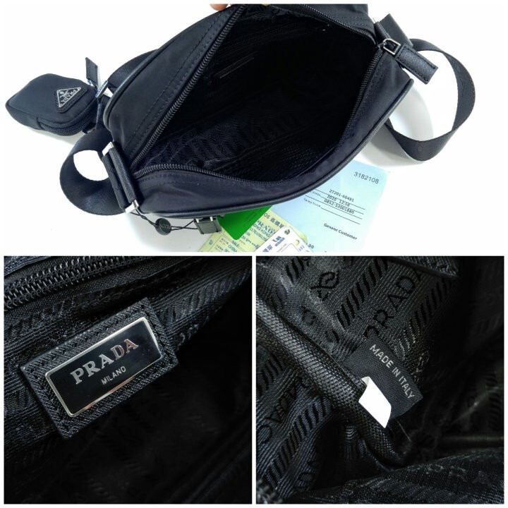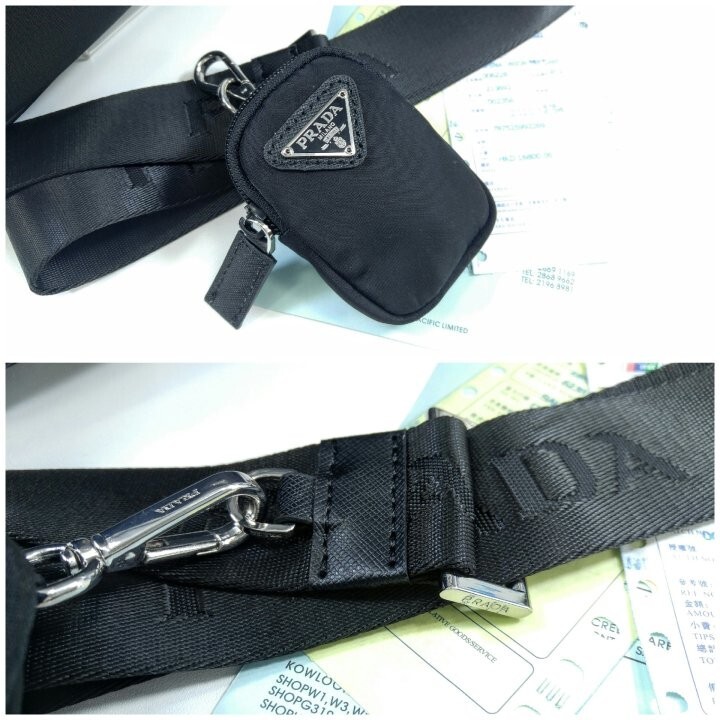 맞춤 조절형 95cm 우븐 테이브 숄더 스트랩 리나일론 탈부착형 지퍼 파우치 지퍼 포켓 메탈 하드웨어 전면에 에나멜 메탈 트라이앵글 로고 지퍼 클로저 지퍼 포켓이 달린 리나일론 로고 프린트 라이닝