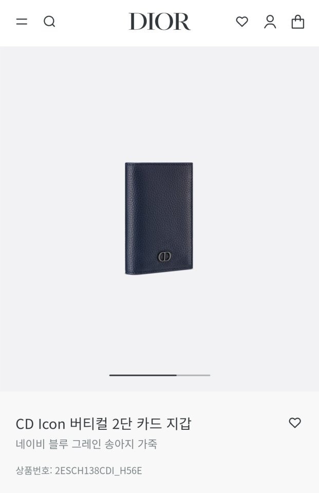 주요 소재: 송아지 가죽 송아지 가죽 & 테크니컬 패브릭 안감 카드 슬롯 6개 영수증 수납용 슬립 포켓 2개 앞면 루테늄 피니시 브라스 CD Icon 시그니처 내부 시그니처 엠보싱