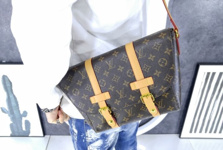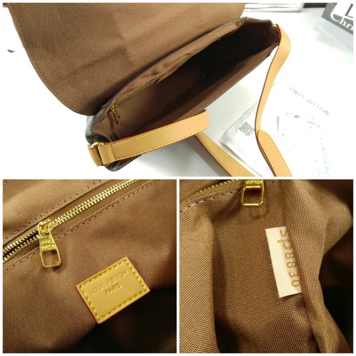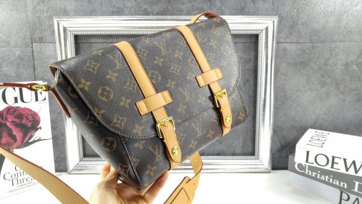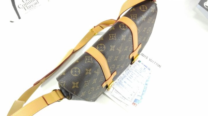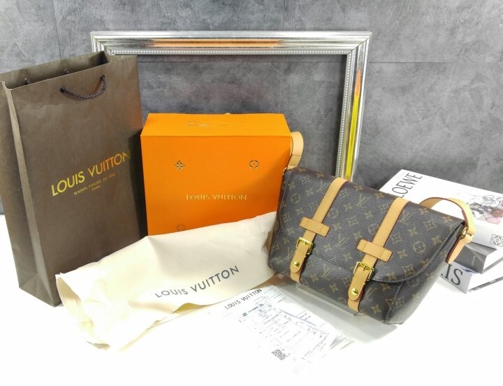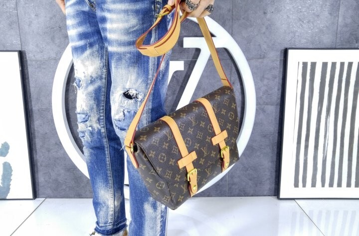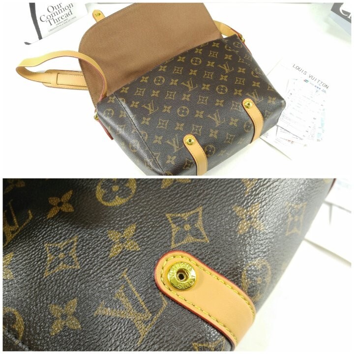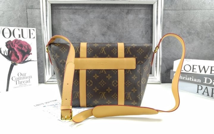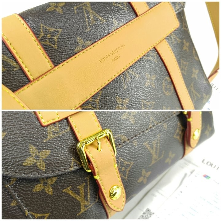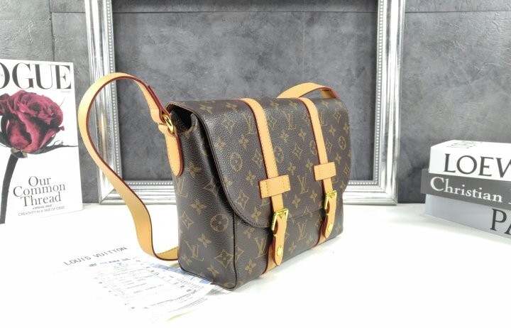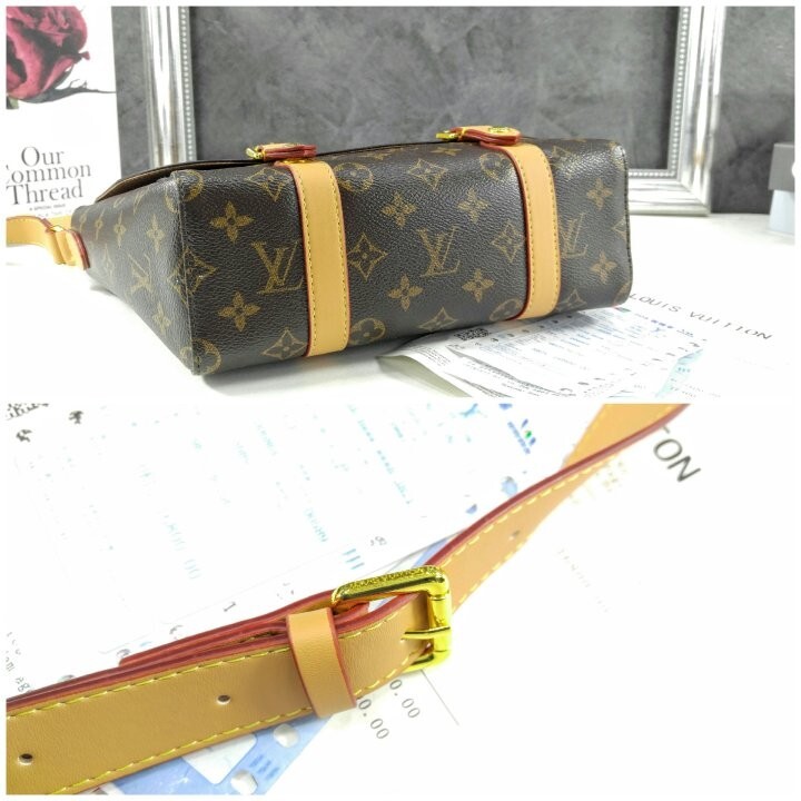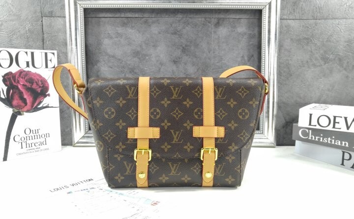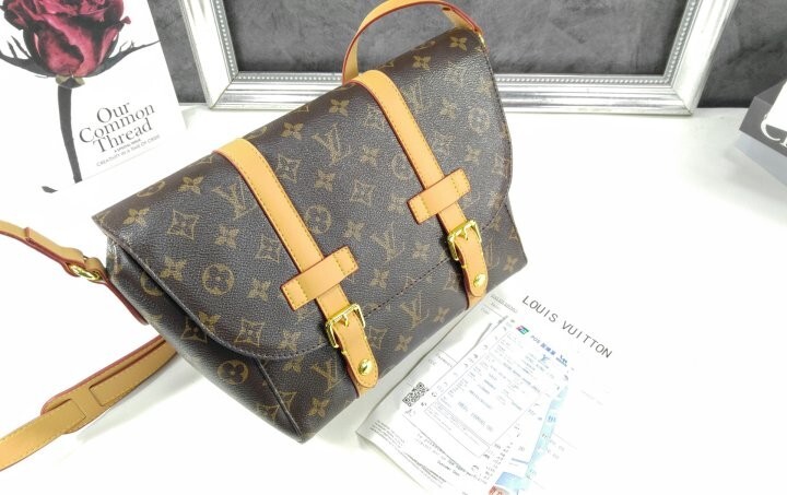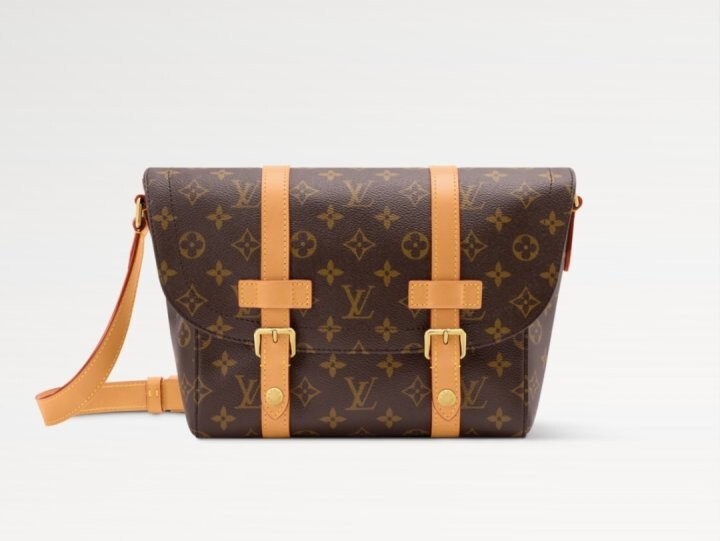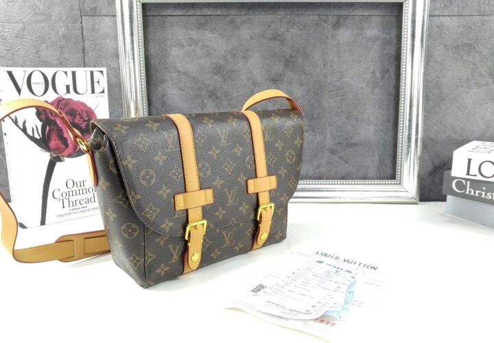 모노그램 아카이브 코팅 캔버스 천연 에이지드 카우하이드 가죽 트리밍 텍스타일 안감 골드 색상의 하드웨어 자석형 잠금장치 메인 수납공간 내부 플랫 포켓 스트랩:탈부착 불가능, 길이 조절 가능