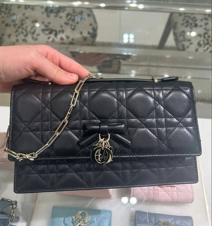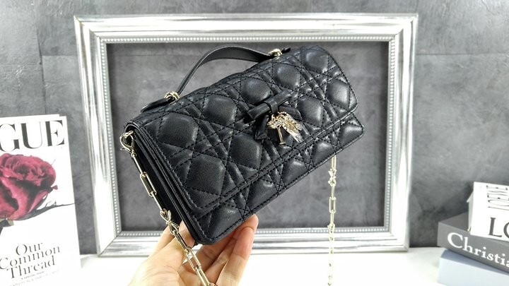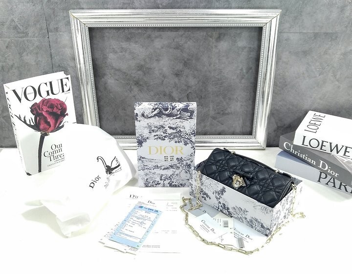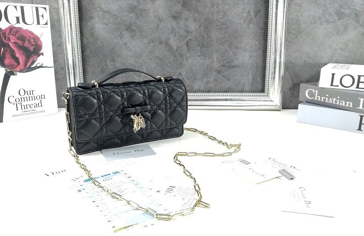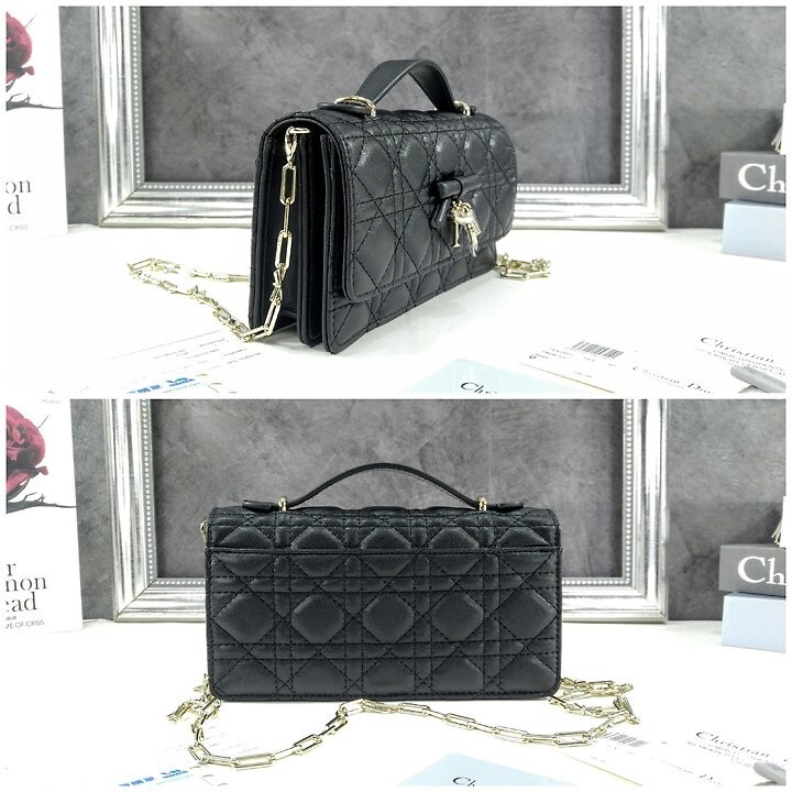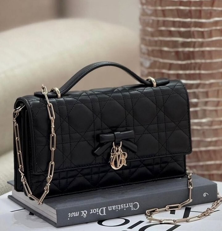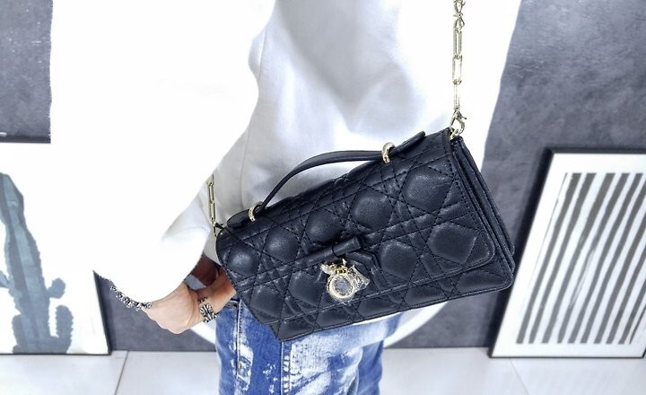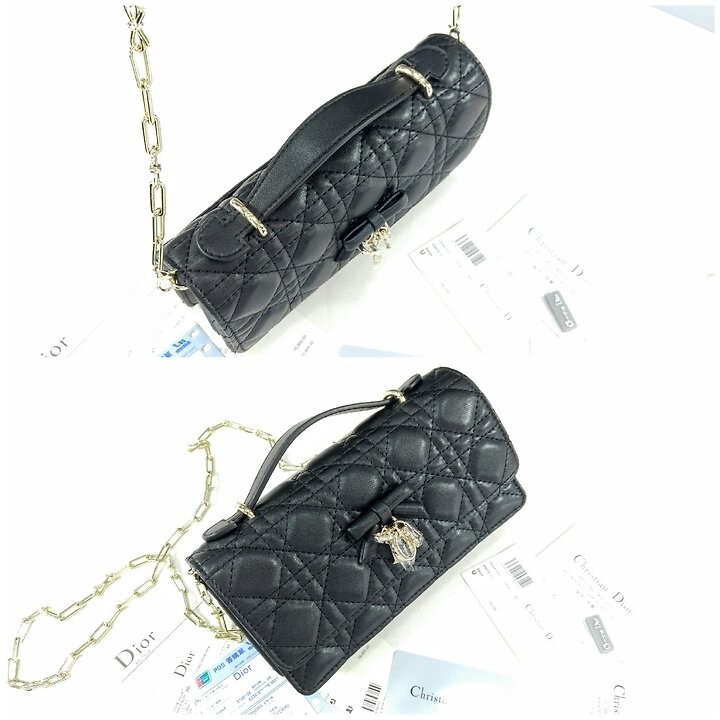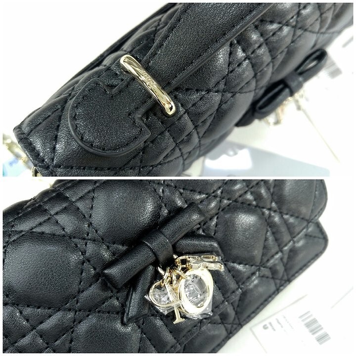 주요 소재: 램스킨 램스킨 & 테크니컬 패브릭 안감 앞면 장식용 보우 및 D.I.O.R. 블록 참 플랩 클로저 내부 수납공간 2개 뒷면 슬립 포켓 카드 슬롯 3개 접이식 가죽 탑 핸들 탈착식 주얼리 체인