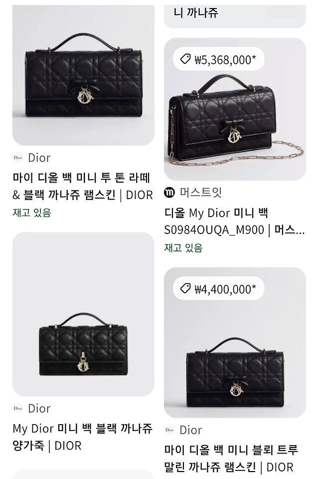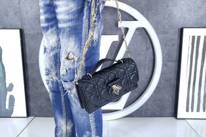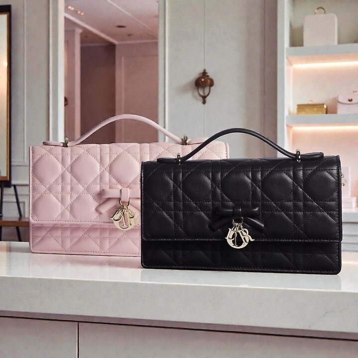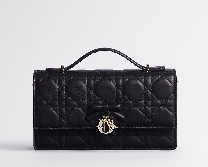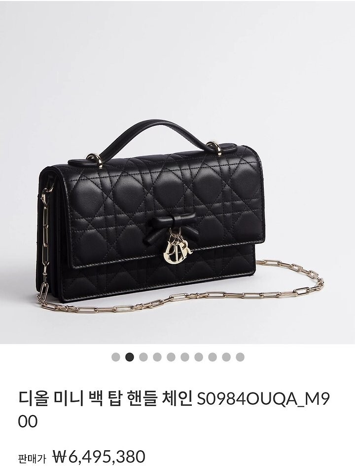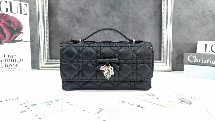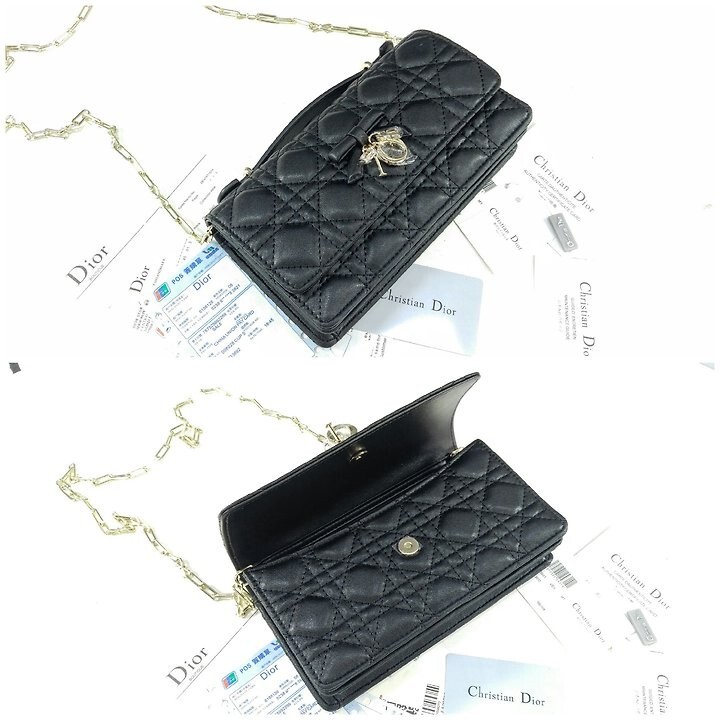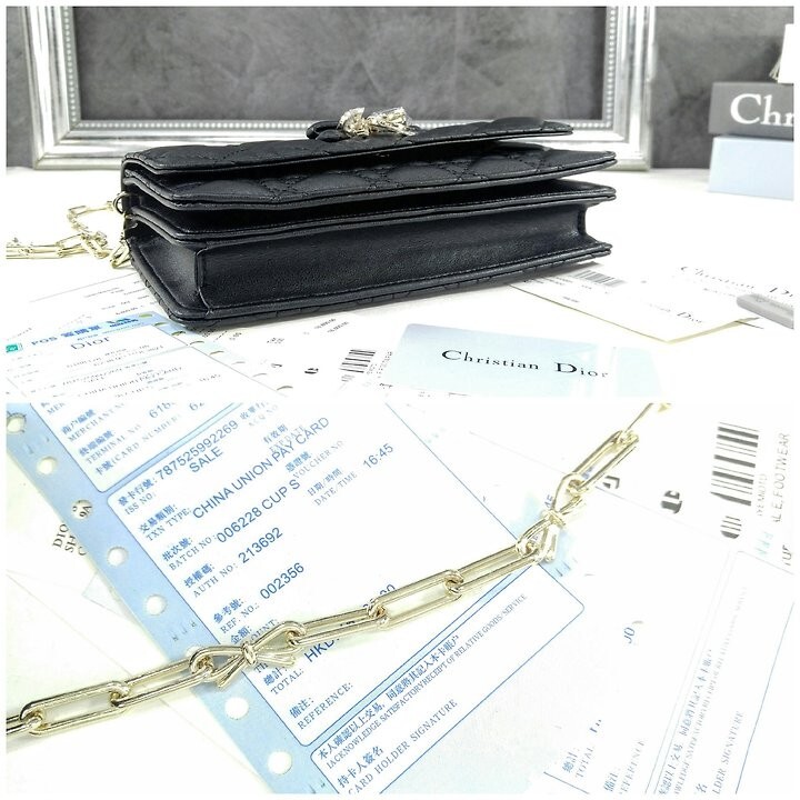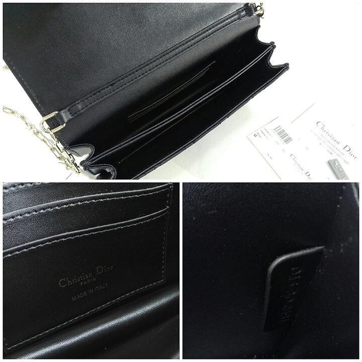 주요 소재: 램스킨 램스킨 & 테크니컬 패브릭 안감 앞면 장식용 보우 및 D.I.O.R. 블록 참 플랩 클로저 내부 수납공간 2개 뒷면 슬립 포켓 카드 슬롯 3개 접이식 가죽 탑 핸들 탈착식 주얼리 체인