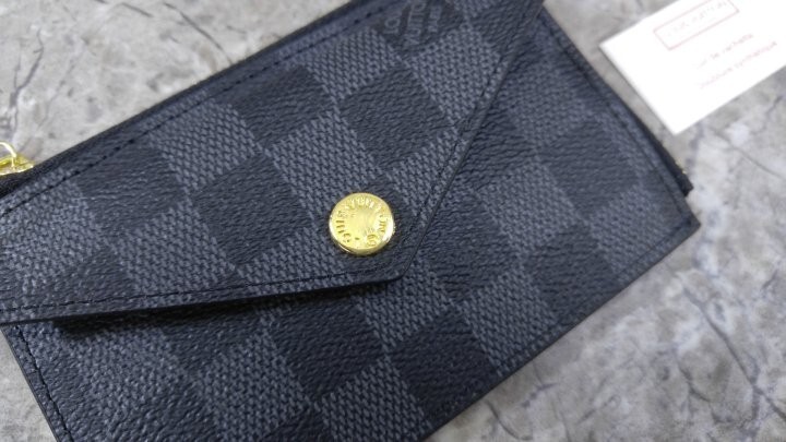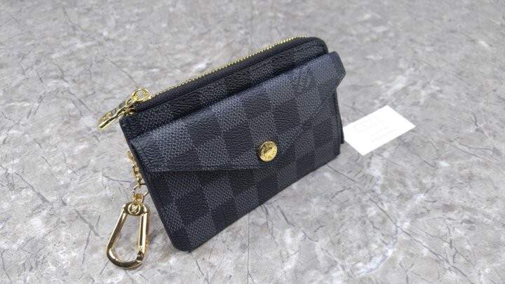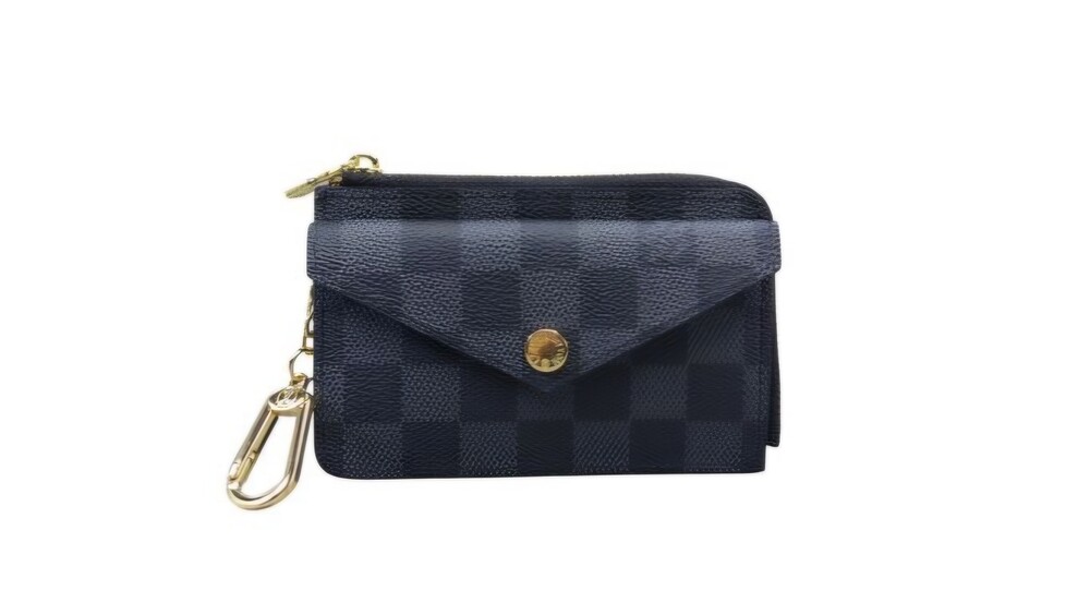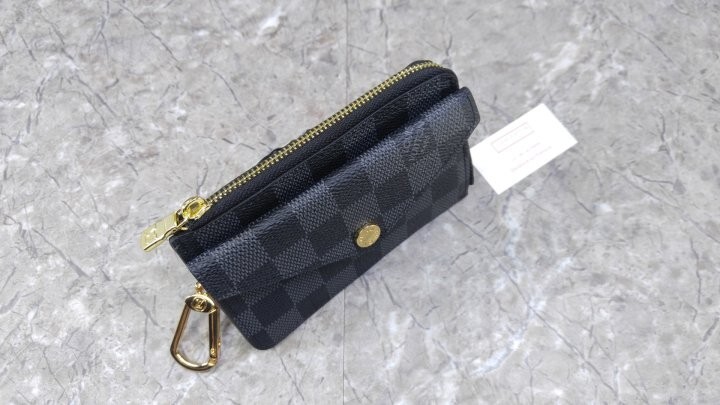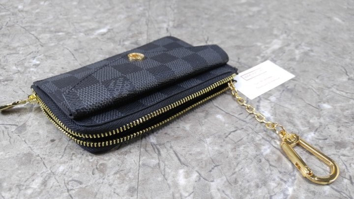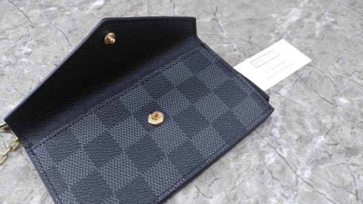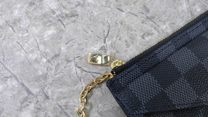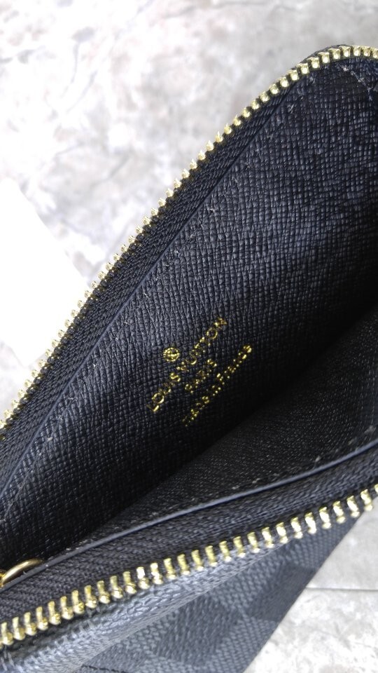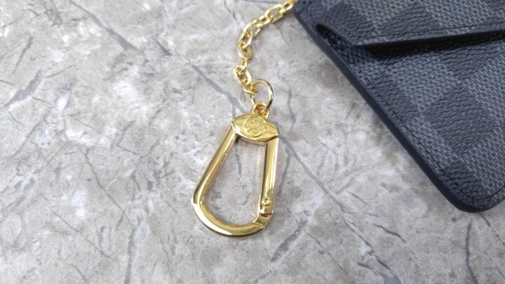 블랙 다미애 카우하이드 가죽 안감 골드 톤 금속 디테일 L 지퍼형 잠금장치 프레스 스터드형 잠금장치 앞면 포켓 중간의 플랫 포켓 카드 슬롯 3개 후크가 달린 체인 뒷면 플랫 포켓