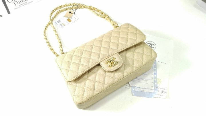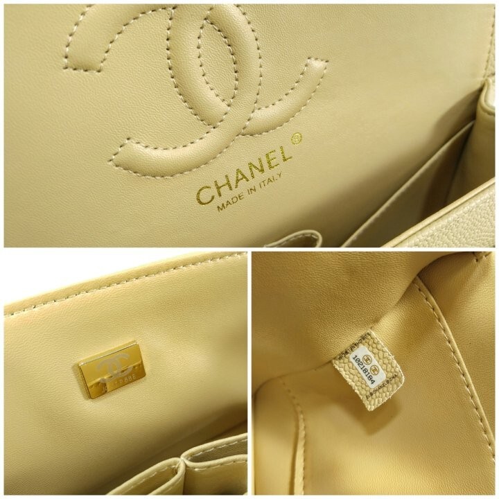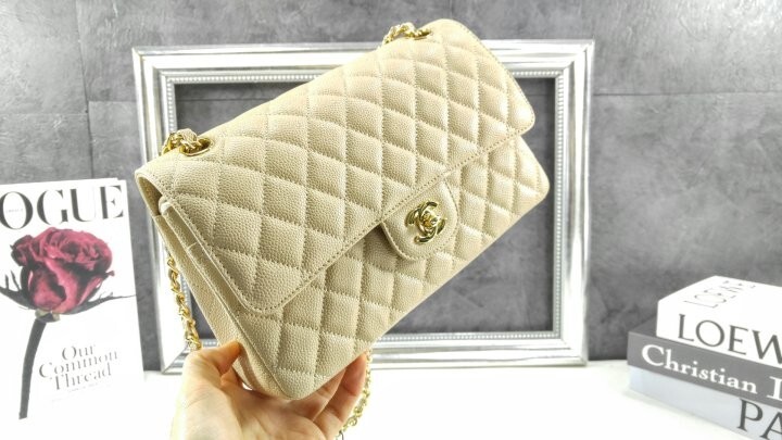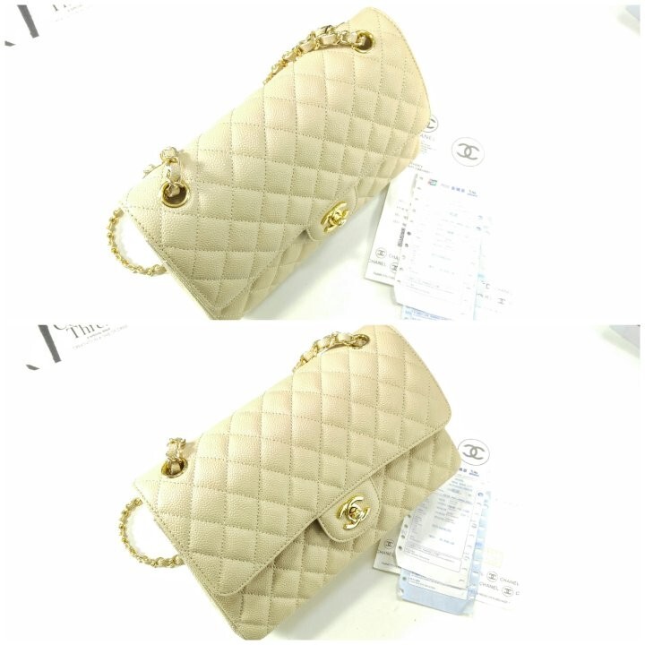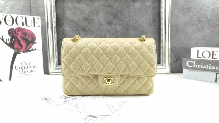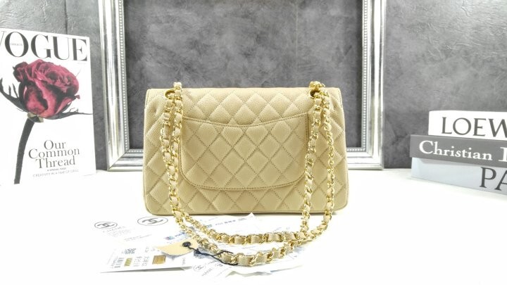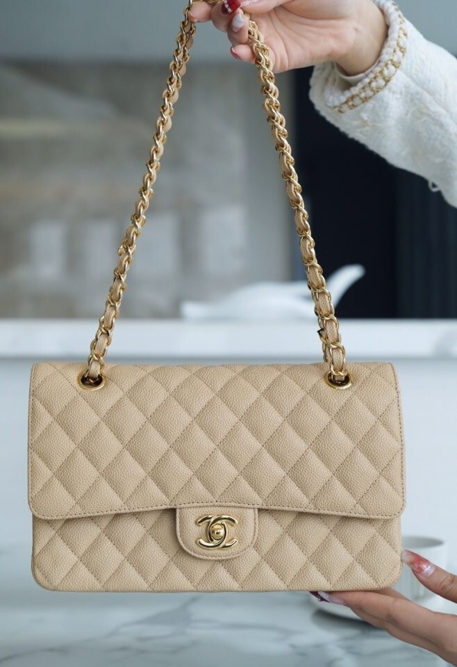 클래식 미디움 플랩백 그레인드 카프스킨 & 골드 메탈 베이지