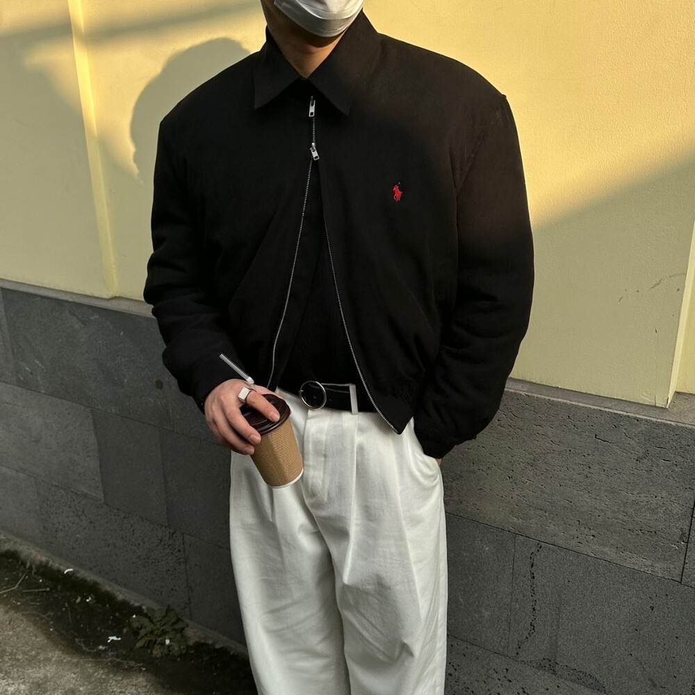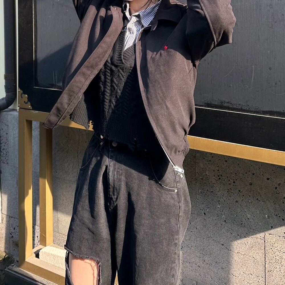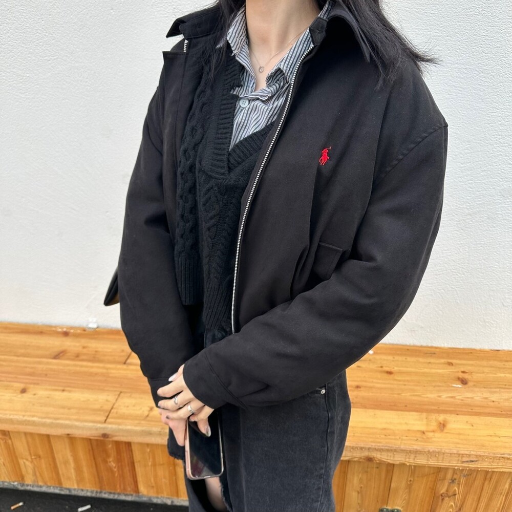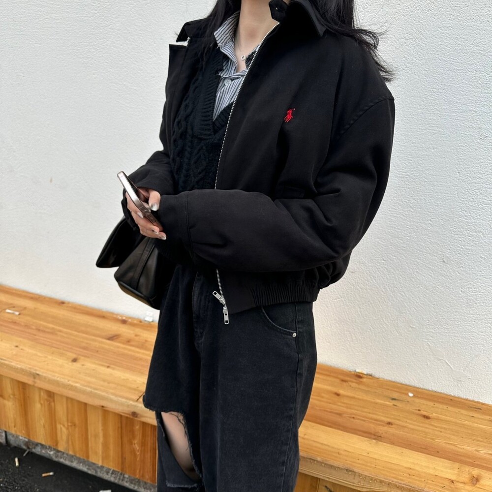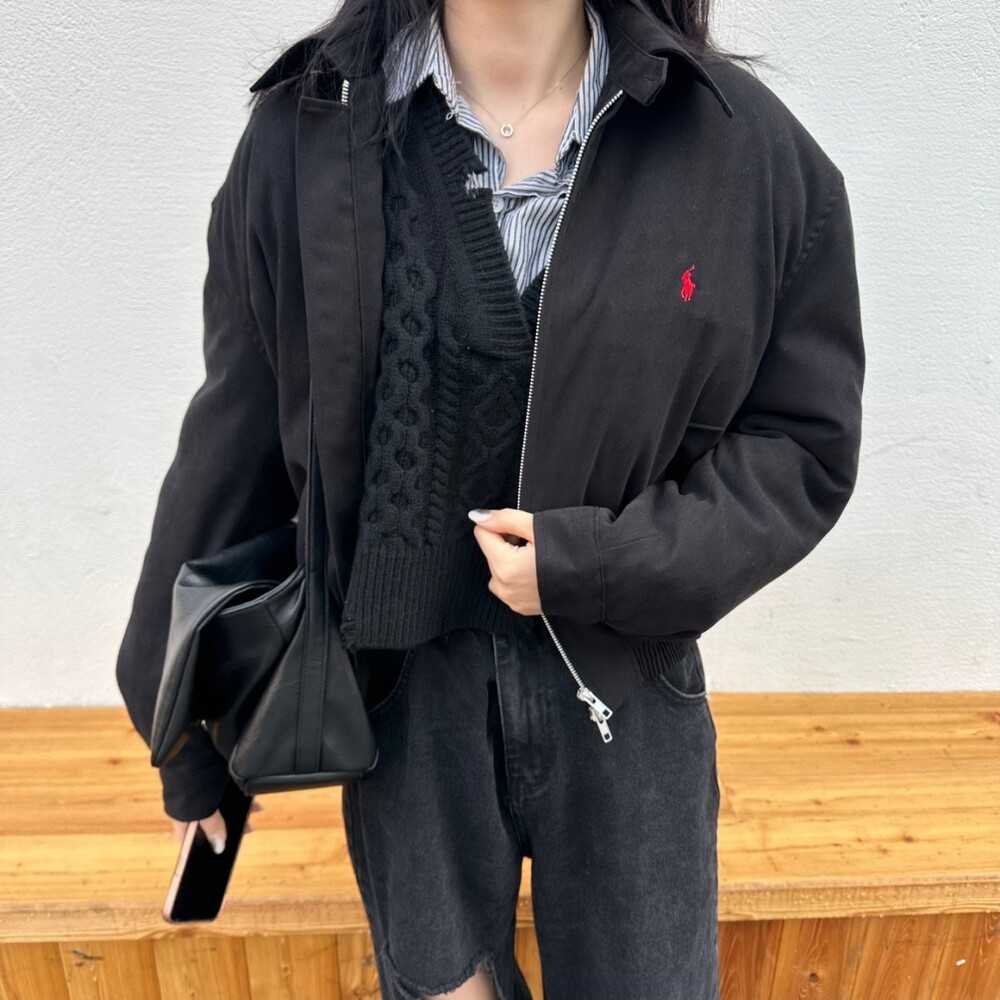 세미오버 핏에 크롭한 기장의 블루종 스타일이며 전체적으로 볼륨감 있어 보이며 너무 짧지도 길지도 않은 기장과 언발란스하게 마무리하여 착용시 핏이 이쁘게 떨어집니다