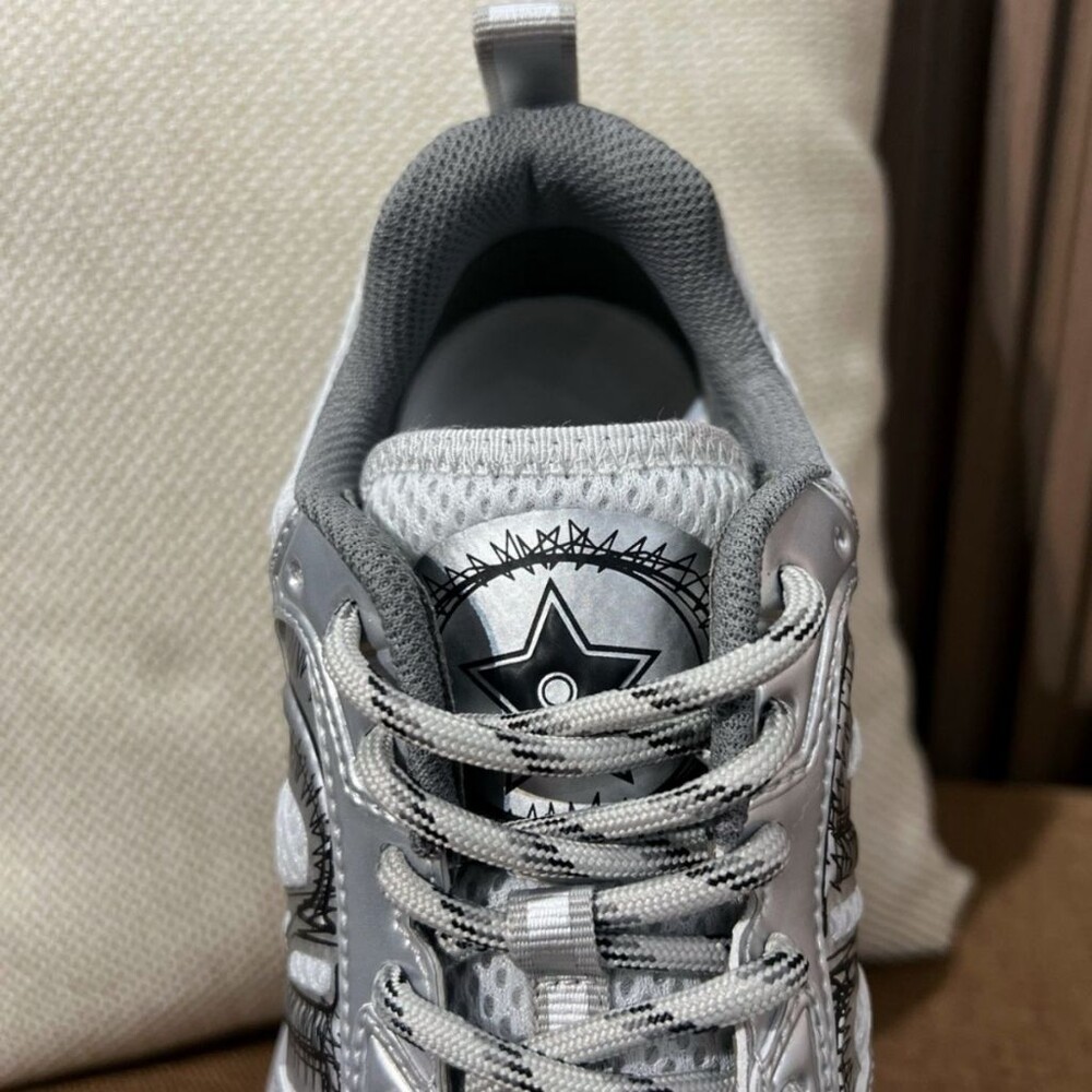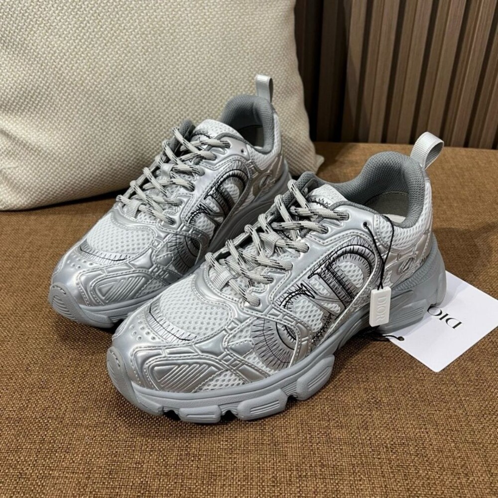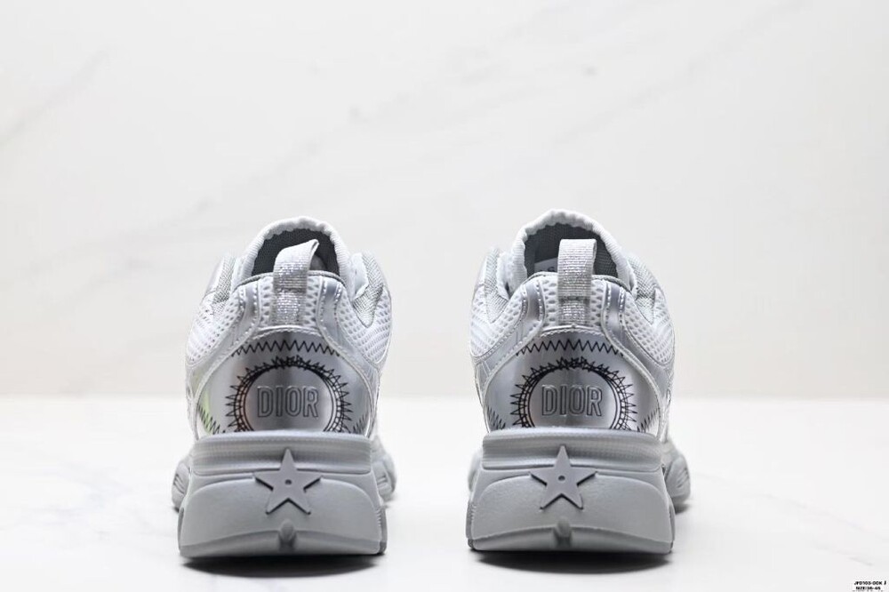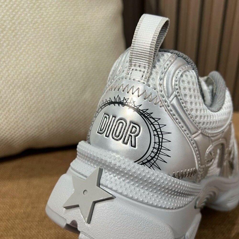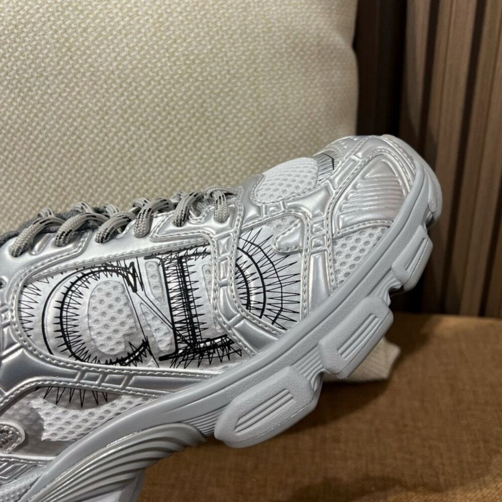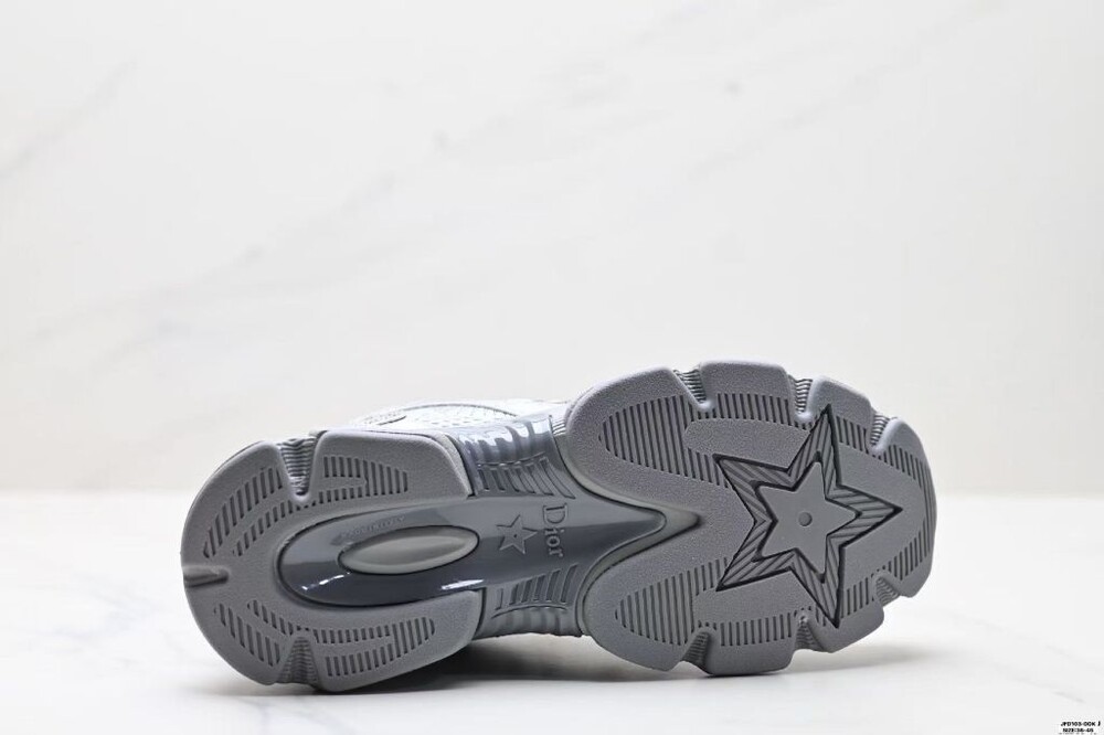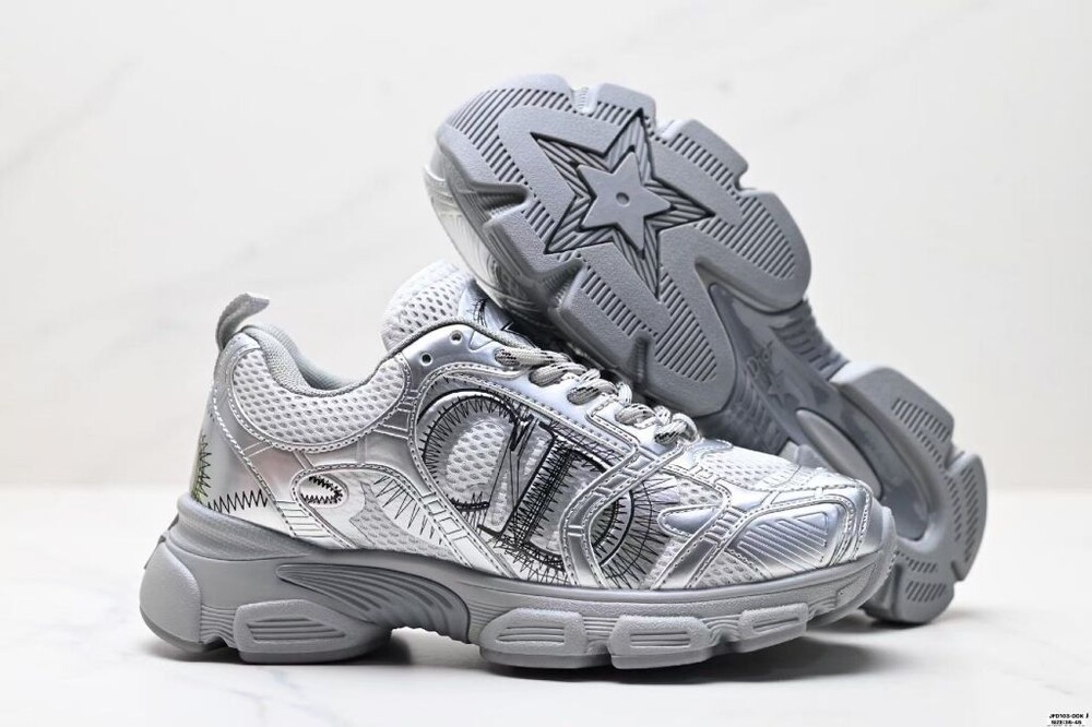 러닝 슈즈를 꾸뛰르 코드로 재해석한 스니커즈입니다. 그레이 컬러의 메시 소재와 실버 톤 래미네이트 레더-이펙트 패널로 제작되었으며 옆면의 CD 시그니처, 슈텅의 별 패치, 뒷면의 DO 시그니처와 같은 홀마크 디테일이 돋보입니다. 쓰리-톤 슈레이스와 별 디테일의 초경량 솔로 완성된 스니커즈로 모든 시즌 캐주얼한 룩을 완성하기 좋습니다.