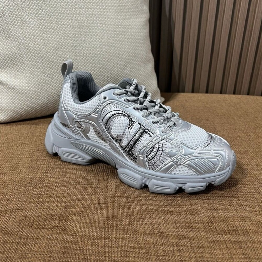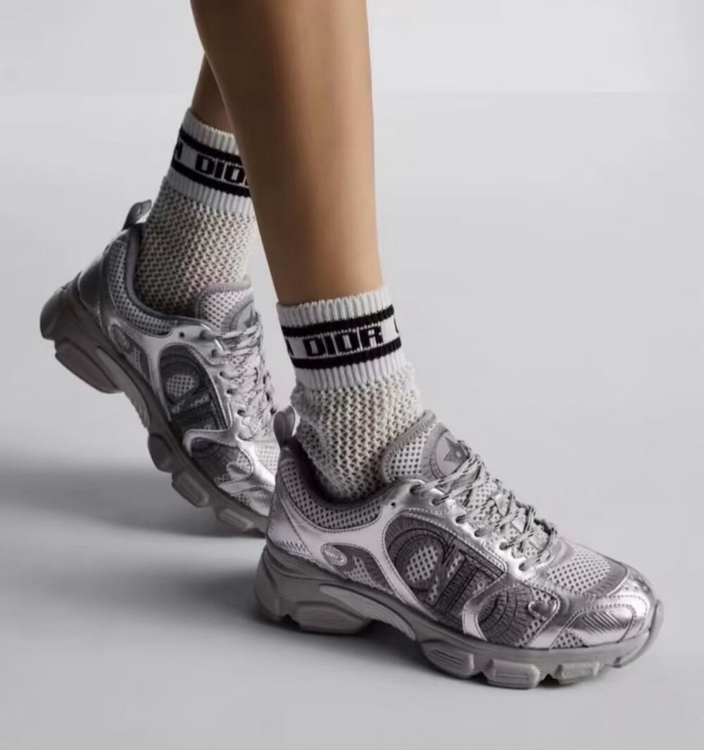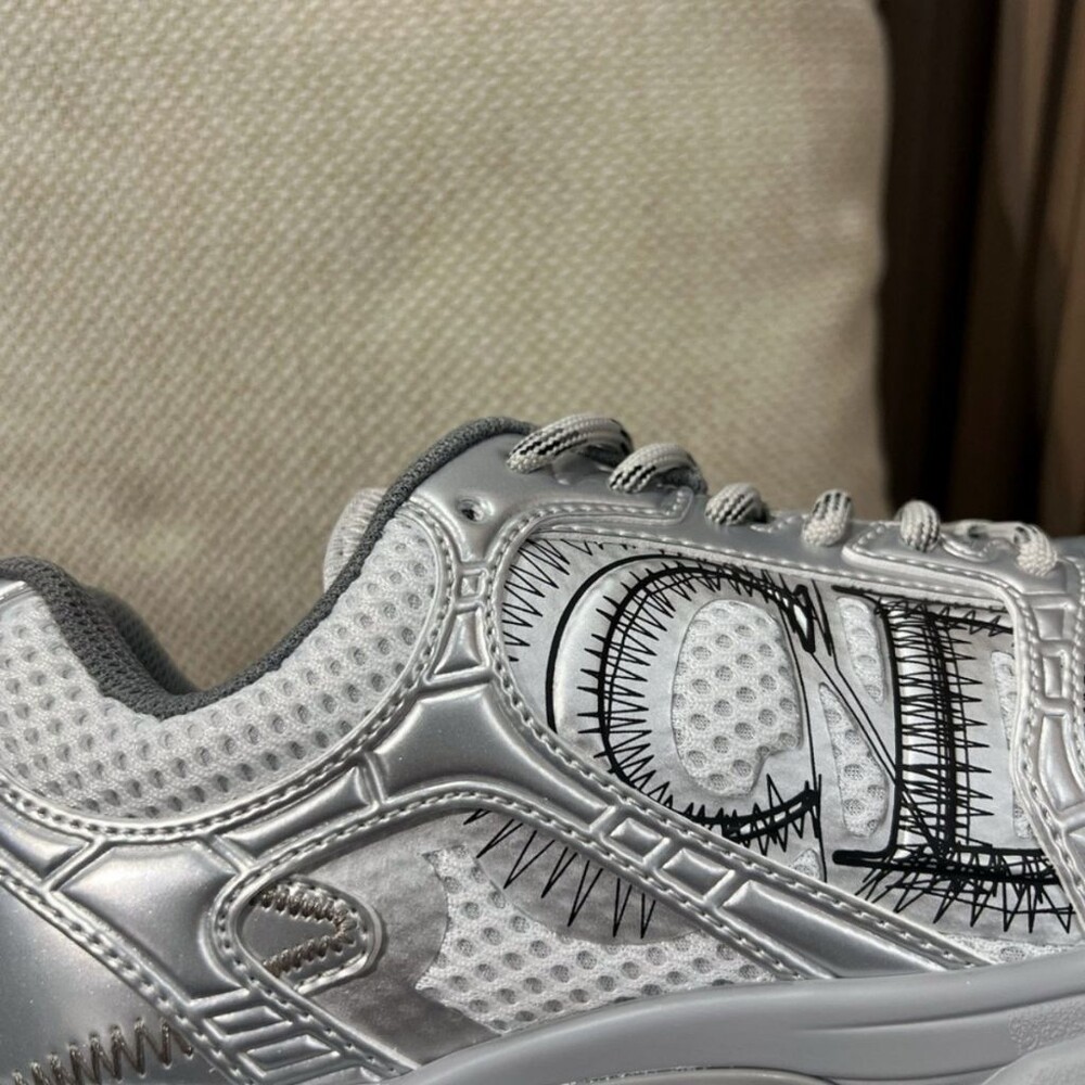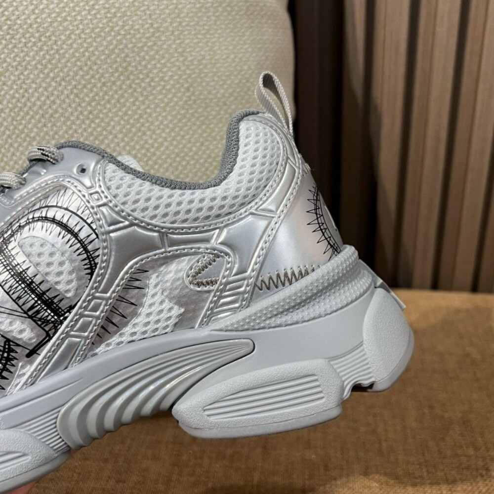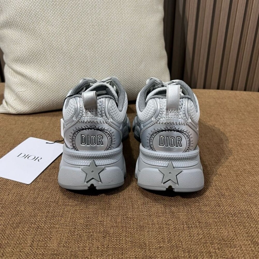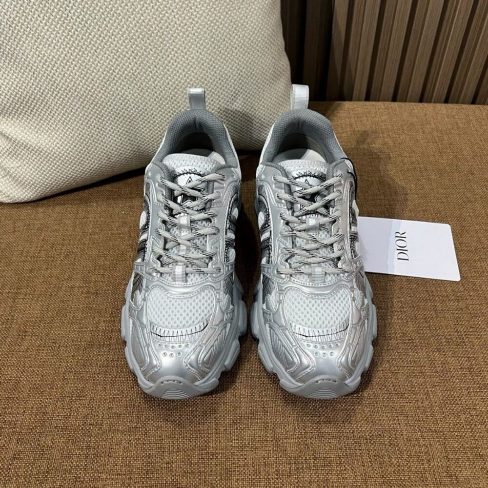 러닝 슈즈를 꾸뛰르 코드로 재해석한 스니커즈입니다. 그레이 컬러의 메시 소재와 실버 톤 래미네이트 레더-이펙트 패널로 제작되었으며 옆면의 CD 시그니처, 슈텅의 별 패치, 뒷면의 DO 시그니처와 같은 홀마크 디테일이 돋보입니다. 쓰리-톤 슈레이스와 별 디테일의 초경량 솔로 완성된 스니커즈로 모든 시즌 캐주얼한 룩을 완성하기 좋습니다.