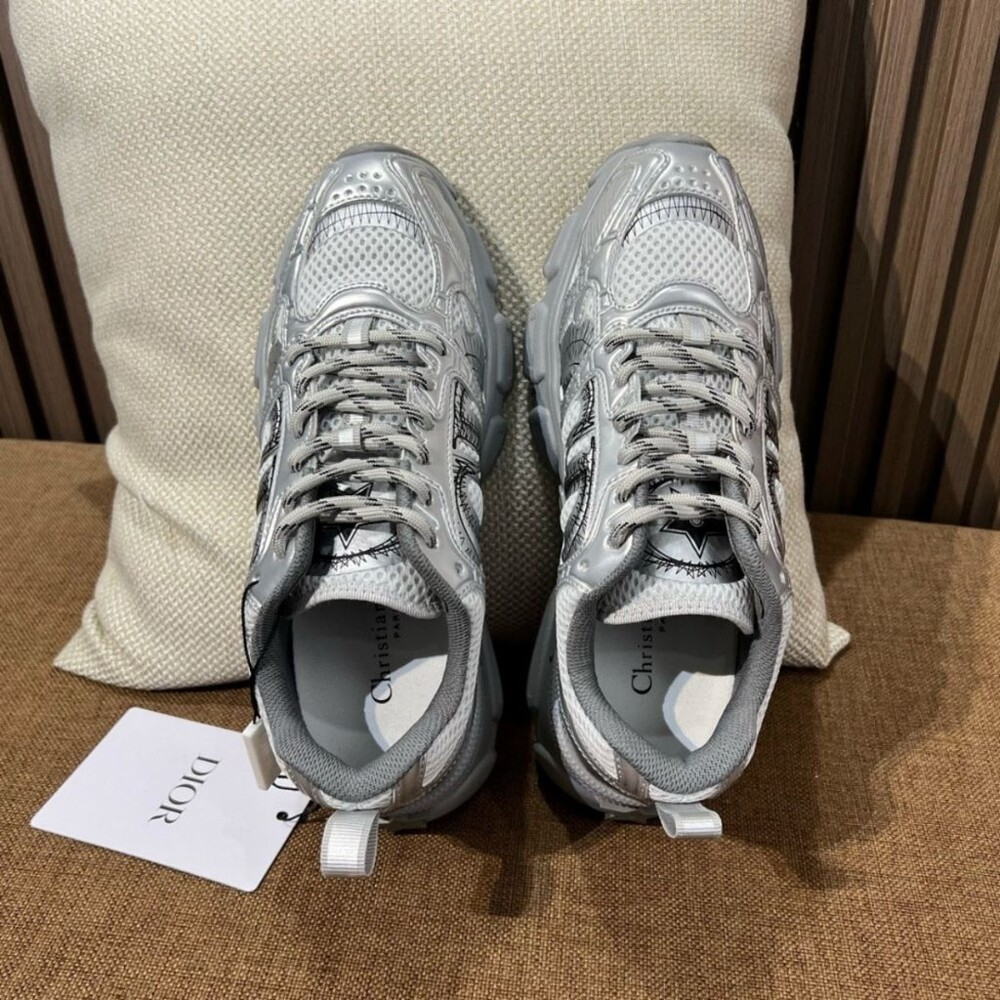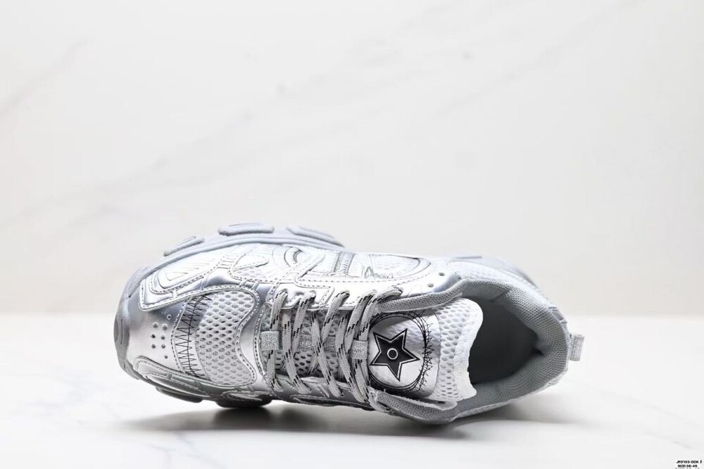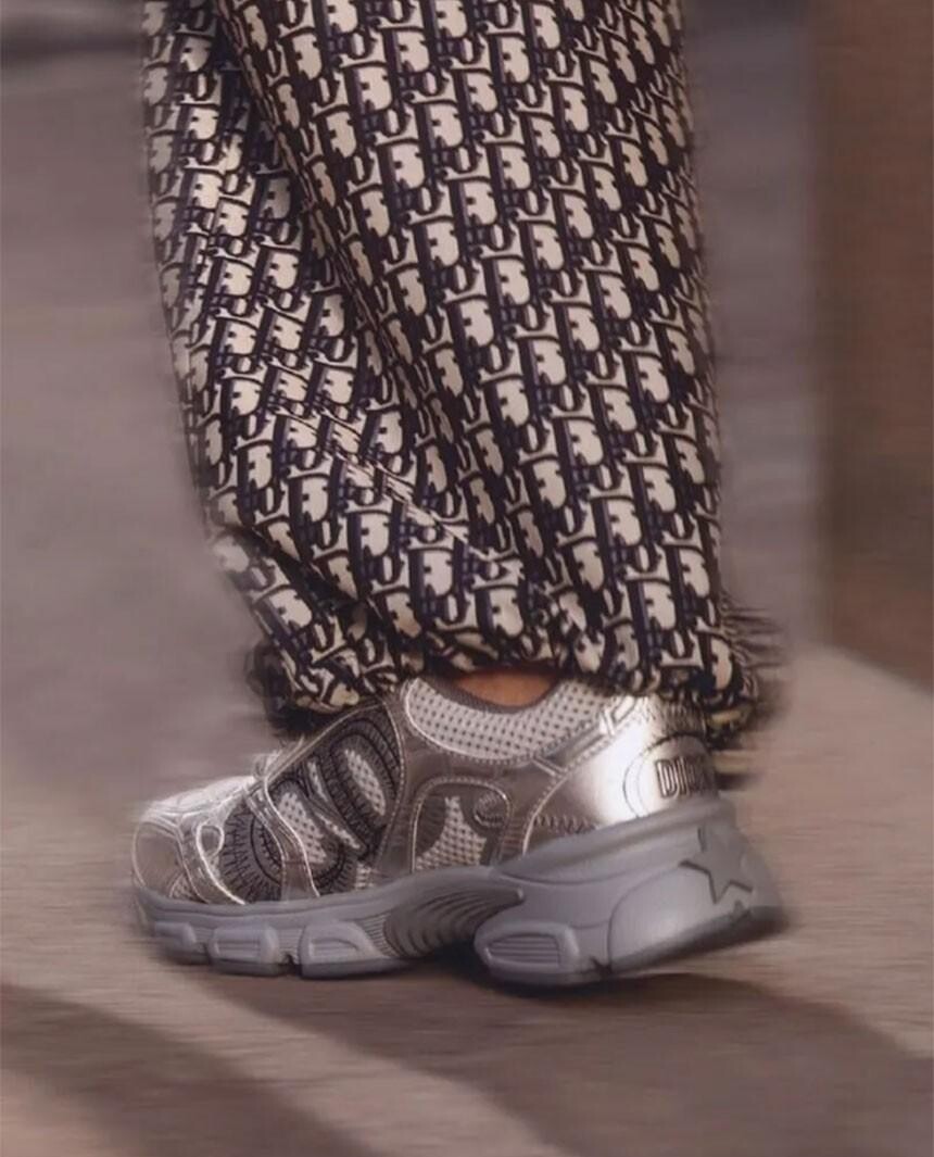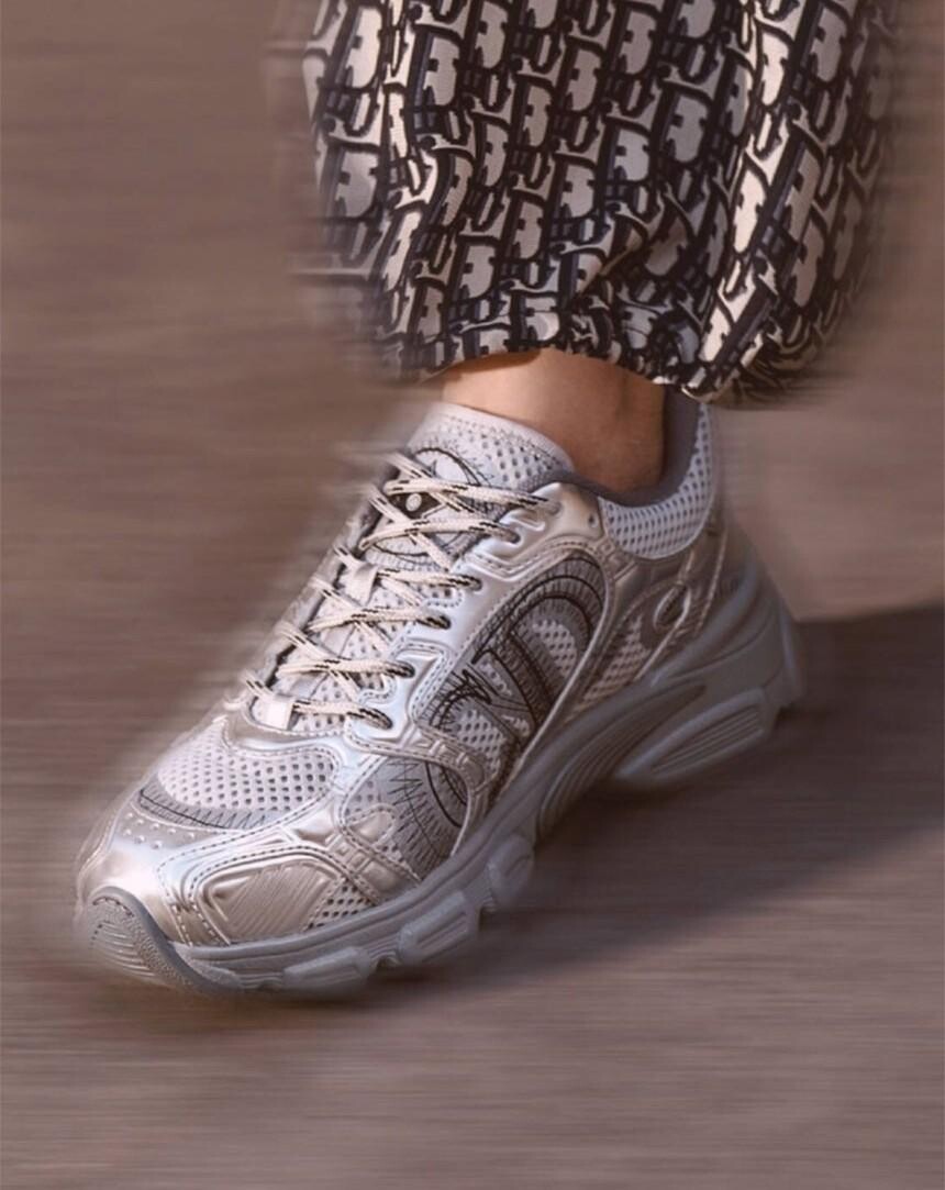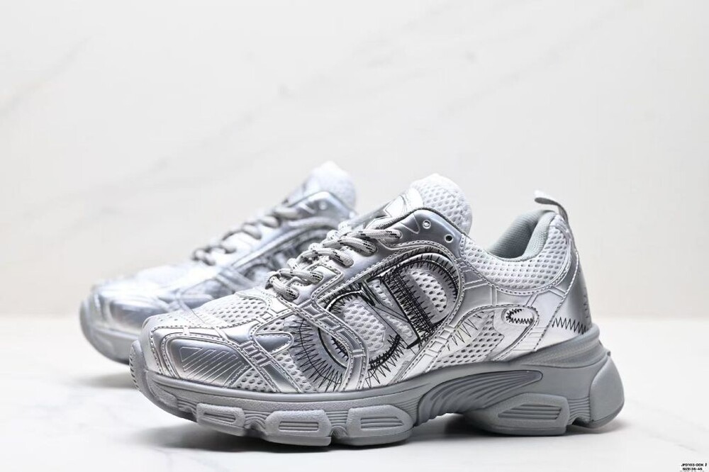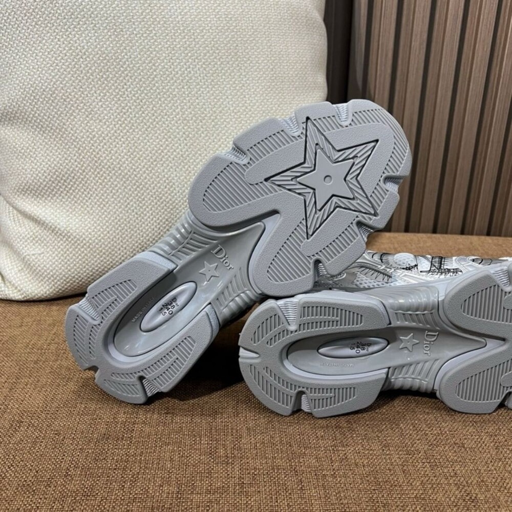 러닝 슈즈를 꾸뛰르 코드로 재해석한 스니커즈입니다. 그레이 컬러의 메시 소재와 실버 톤 래미네이트 레더-이펙트 패널로 제작되었으며 옆면의 CD 시그니처, 슈텅의 별 패치, 뒷면의 DO 시그니처와 같은 홀마크 디테일이 돋보입니다. 쓰리-톤 슈레이스와 별 디테일의 초경량 솔로 완성된 스니커즈로 모든 시즌 캐주얼한 룩을 완성하기 좋습니다.