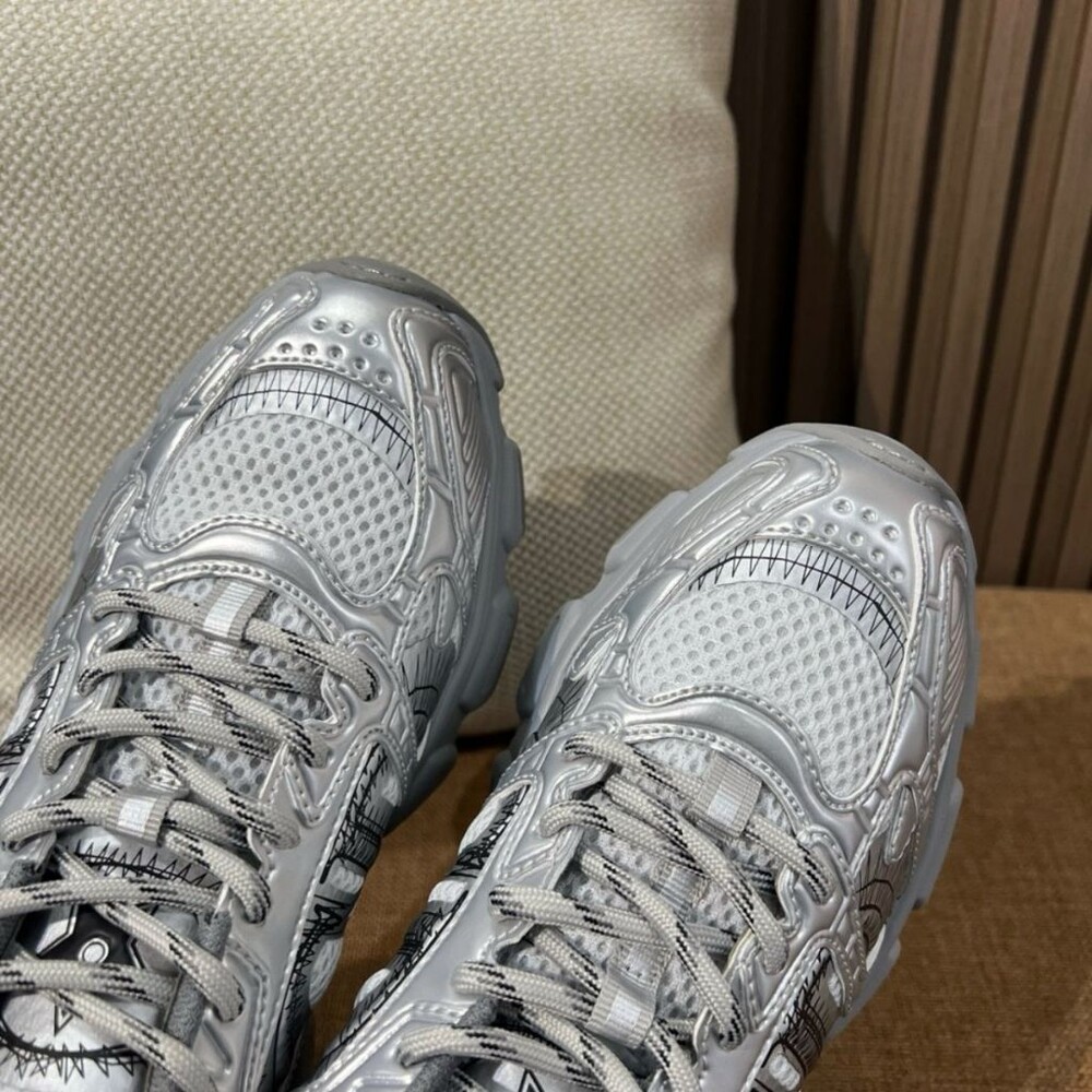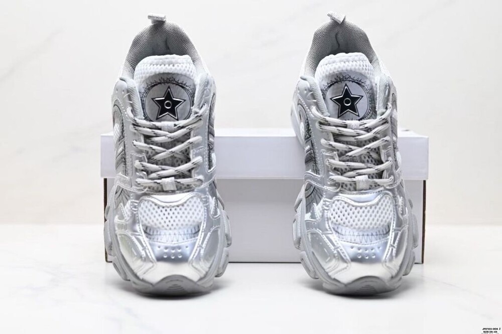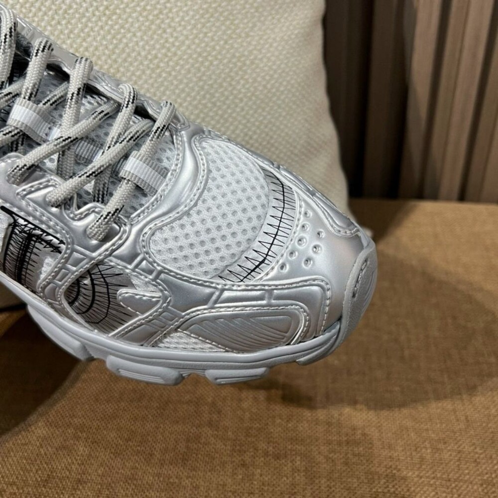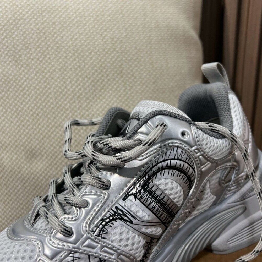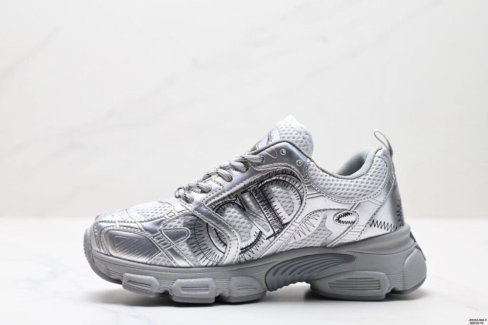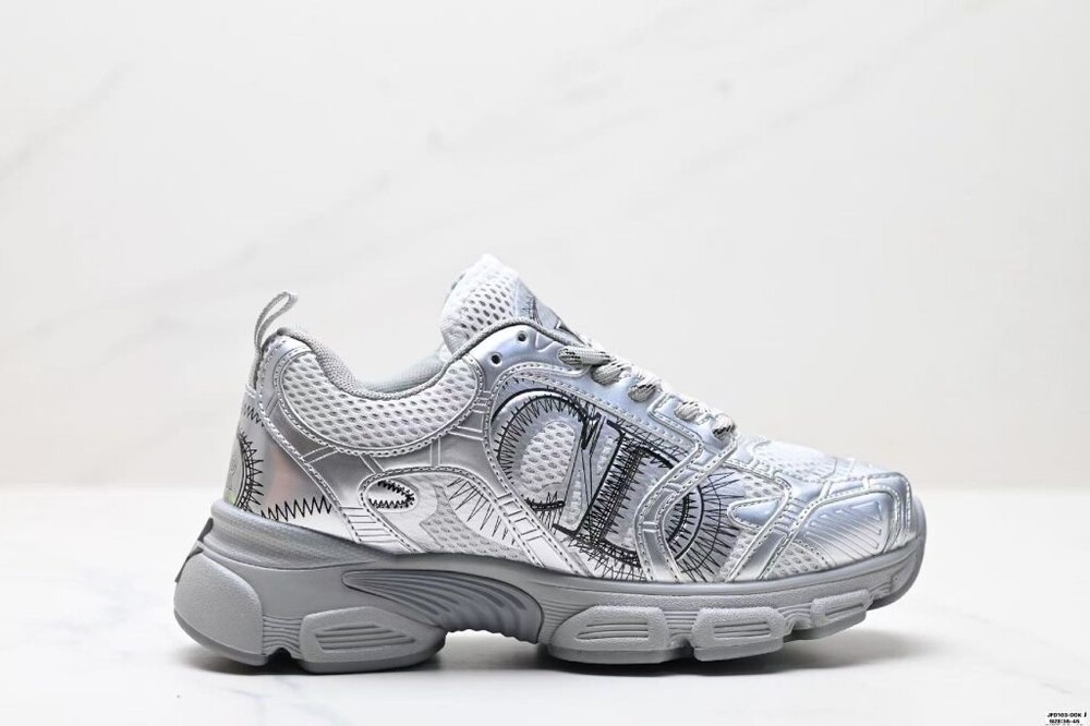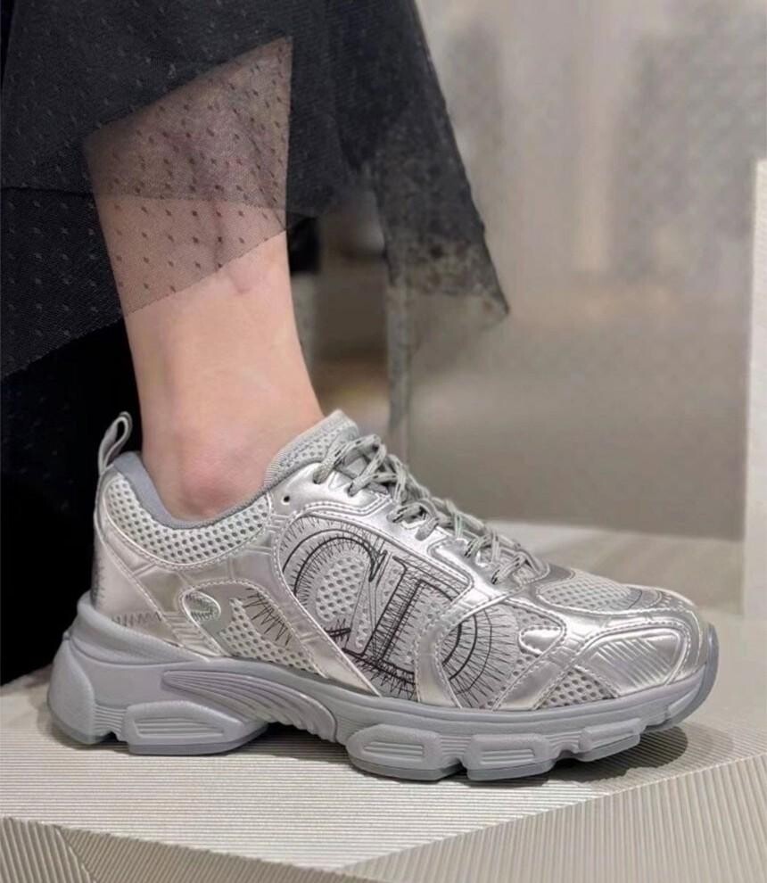 러닝 슈즈를 꾸뛰르 코드로 재해석한 스니커즈입니다. 그레이 컬러의 메시 소재와 실버 톤 래미네이트 레더-이펙트 패널로 제작되었으며 옆면의 CD 시그니처, 슈텅의 별 패치, 뒷면의 DO 시그니처와 같은 홀마크 디테일이 돋보입니다. 쓰리-톤 슈레이스와 별 디테일의 초경량 솔로 완성된 스니커즈로 모든 시즌 캐주얼한 룩을 완성하기 좋습니다.