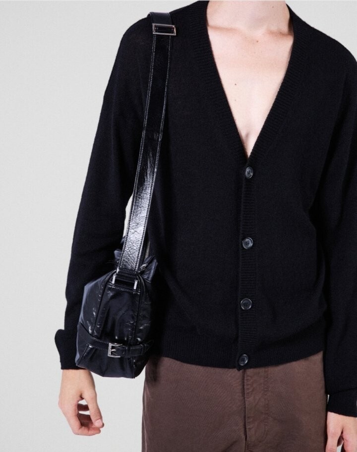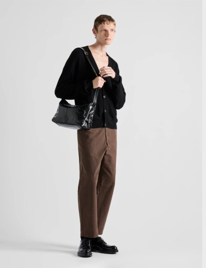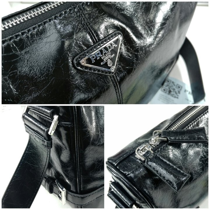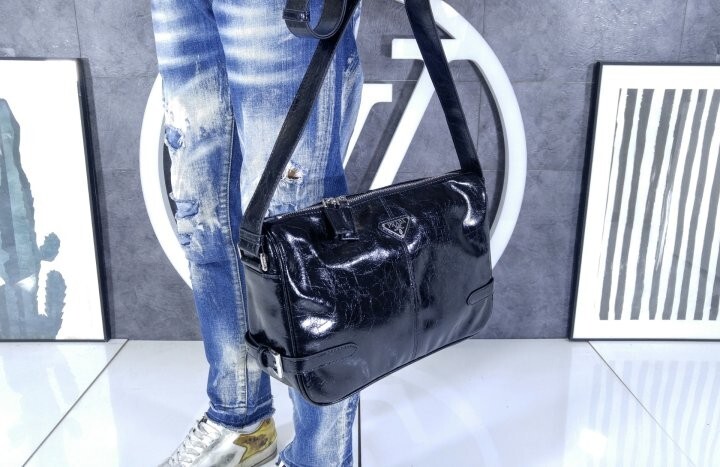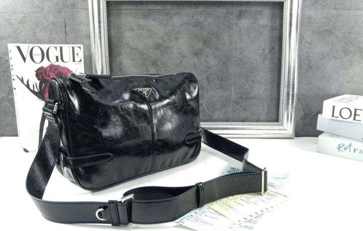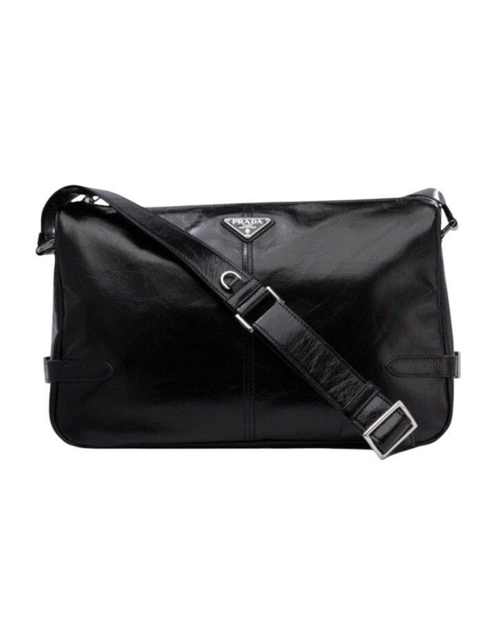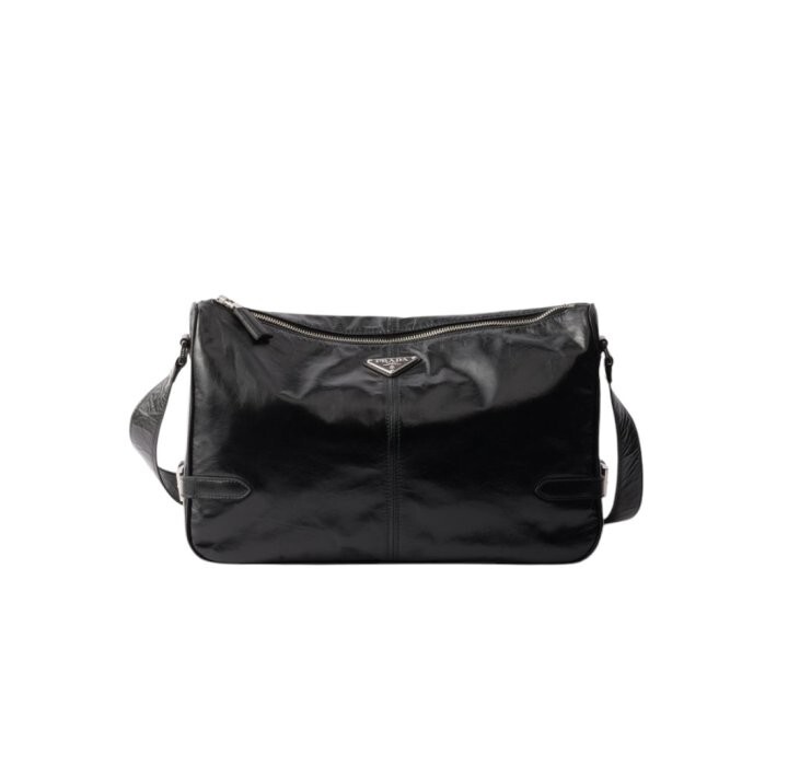 광택 마감의 부드러운 가죽으로 제작된 모던하고 활용도 높은 숄더백은 세련된 디자인과 고급스러운 디테일이 돋보이며 특별한 트라이앵글 로고로 장식되어 있습니다.