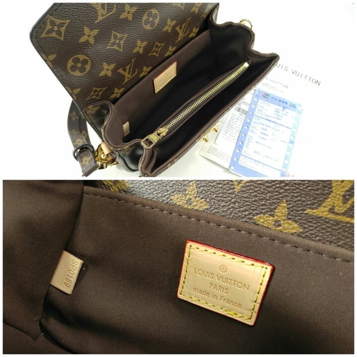 모노그램 코팅 캔버스 천연 카우하이드 가죽 소재의 트리밍 텍스타일 소재의 안감 골드 색상 하드웨어 S락 잠금장치 외부 지퍼형 포켓내부 수납 공간 3개 내부 중앙 부분의 지퍼형 포켓