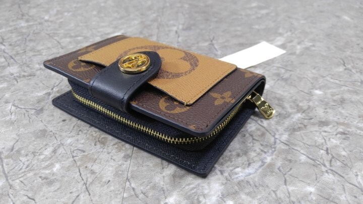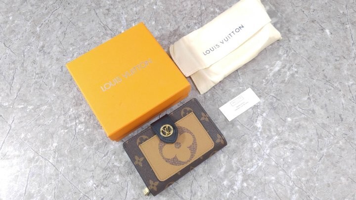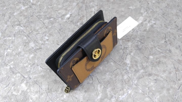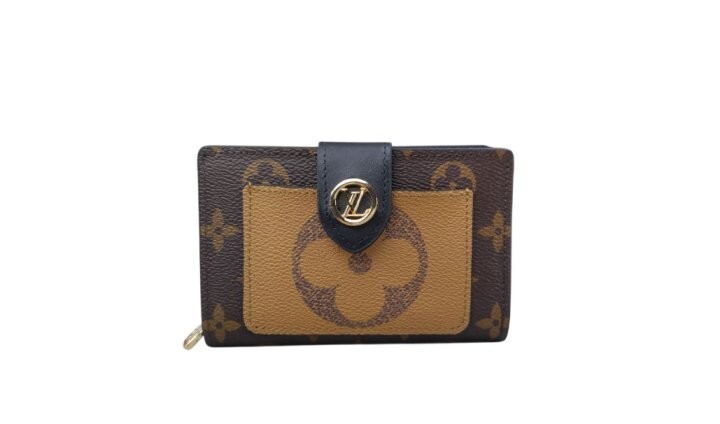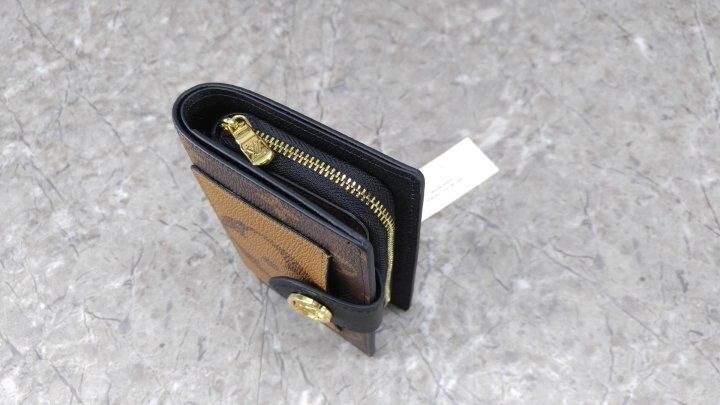 모노그램 및 모노그램 자이언트 리버스 코팅 캔버스 카우하이드 가죽 트리밍 카우하이드 가죽 안감 골드 톤 금속 디테일 프레스 스터드형 잠금장치 앞면 플랫 포켓 대형 지퍼 수납공간 지폐를 접지 않고 수납할 수 있는 플랫 포켓 카드 슬롯 4개