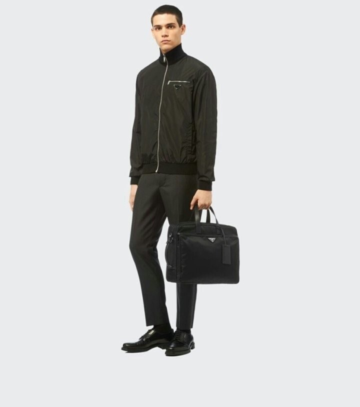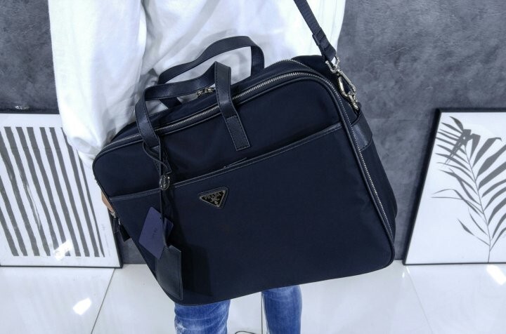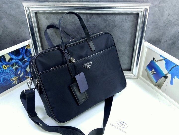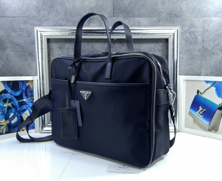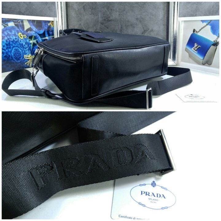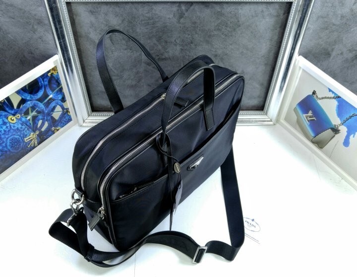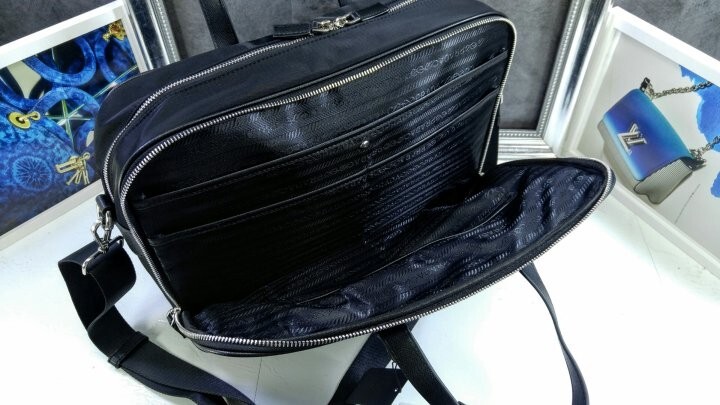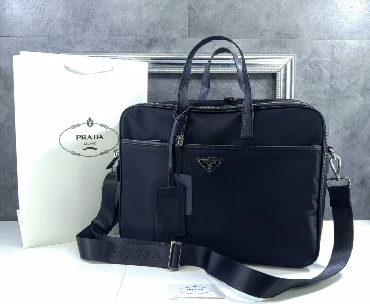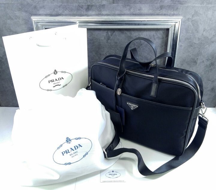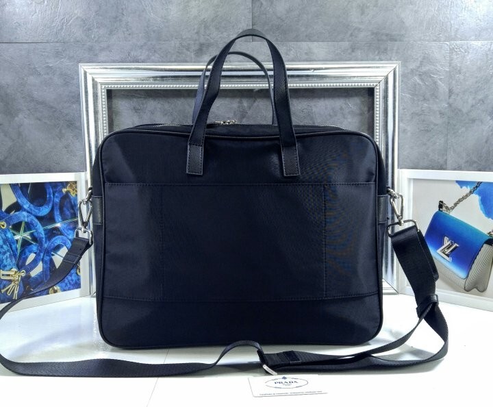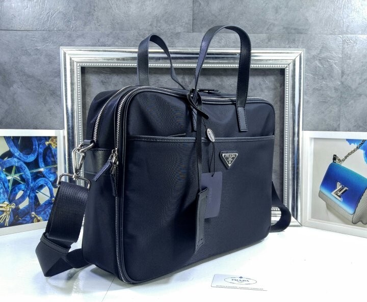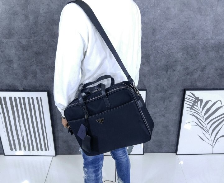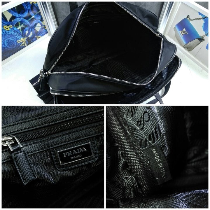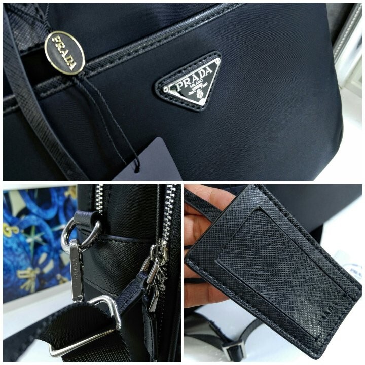 페브릭 / 가죽 2개의 컴파트먼트 플랫 가죽 핸들 탈부착이 가능한 조절 가능한 우븐 나일론 테이프 숄더 스트랩 앞면의 에나멜 메탈 트라이앵글 로고 지퍼 잠금 탈부착 가능한 가죽 이름표 외부 지퍼 포켓 1개 지퍼 포켓과 패치 포켓, 작은 패치 포켓이 있는 내부 로고 프린트 나일론 안감