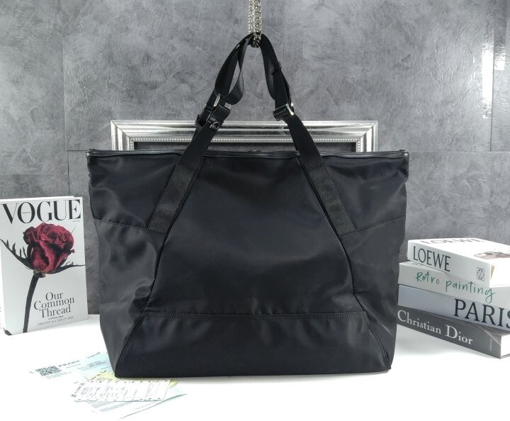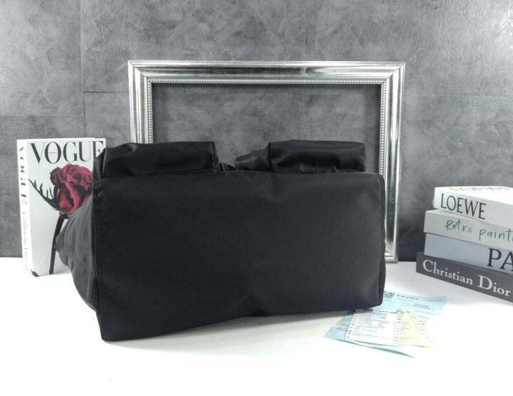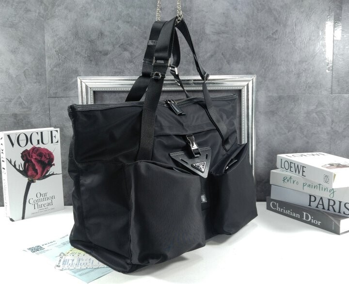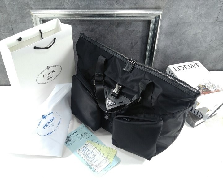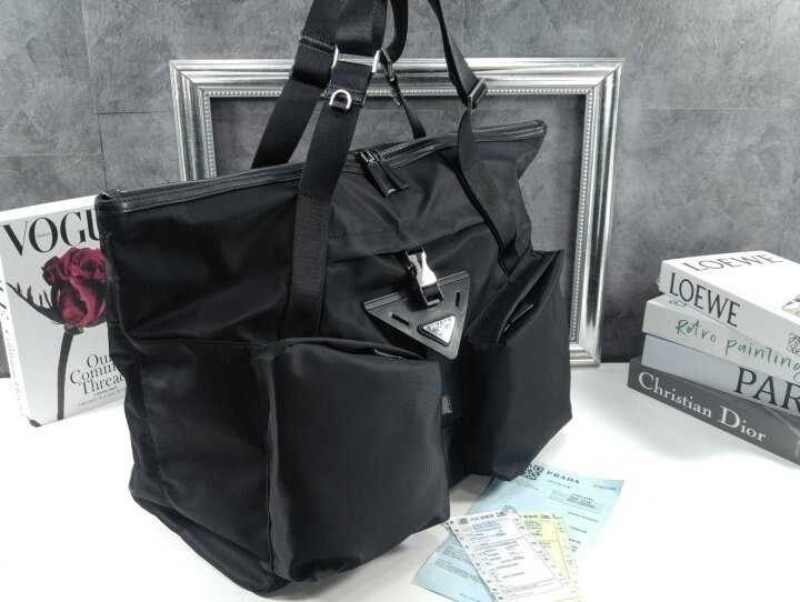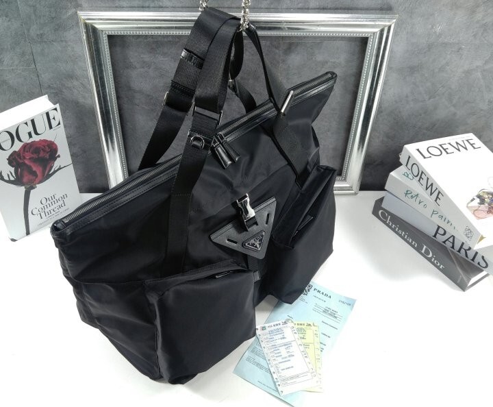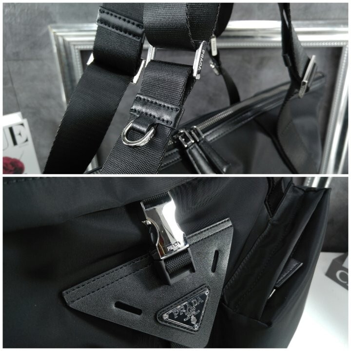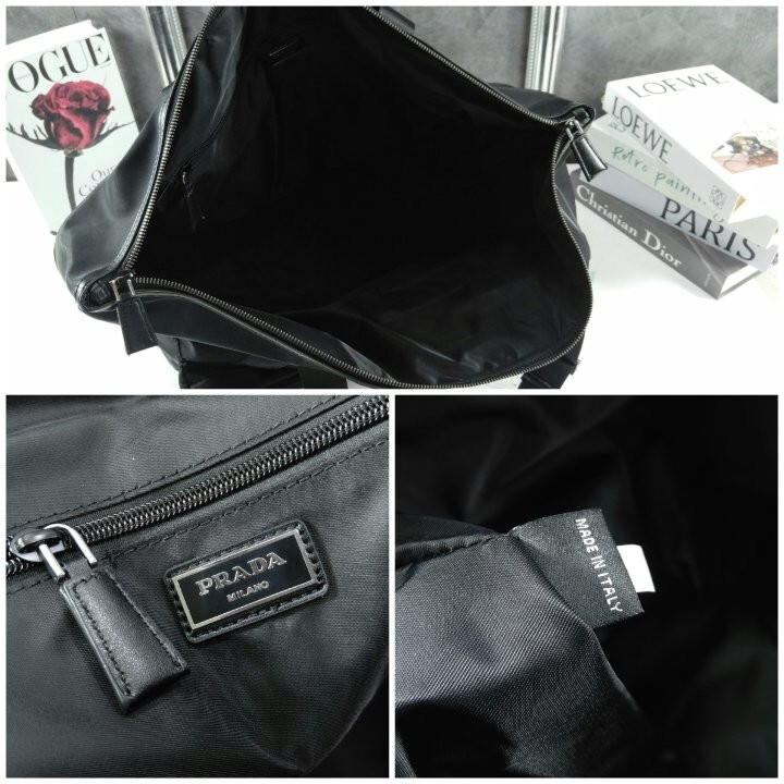가죽 트라이앵글 및 측면 버클식 잠금장치 클로저 맞춤 조절형 나일론 테이프 핸들 전면 에나멜 메탈 트라이앵글 로고 지퍼 클로저 트릭 부착 링 외부 지퍼 포켓 4개 지퍼 포켓이 있는 내부 로고 프린트 리나일론 안감